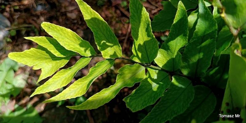Wyglądem przypomina i jest blisko związany z Cyrtomium fortunei, wyróżnia go maksymalnie 14 par listków bocznych, rosnących naprzemiennie.