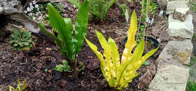 Obydwa egzemplarze Asplenium scolopendrium subsp. japonicum rosna teraz obok siebie w dość słonecznym miejscu . Ten zieleniec dosadziłem niedawno, ale na poprzednim stanowisku też miał sporo słońca. Ciekawe jak będzie później, bo w tej chwili róznica jak widać jest olbrzymia.