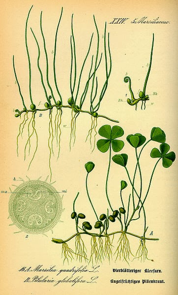 Spójrzcie na świetną rycinę z 'Flora von Deutschland, Österreich und der Schweiz' prof. Otto W. Thomé (1885,Niemcy), przedstawiającą Marsilea quadrifolia i drugą, występującą na naszych terenach, bagienną paproć - Pilularia globulifera( gałuszka kulecznica). Rycina dokładnie pokazuje jej budowę, (małe, ciemne 'fasolki' nad kłączem to sporokarpia) i sposób rozprzestrzeniania się.
