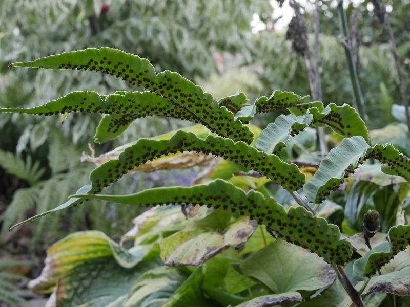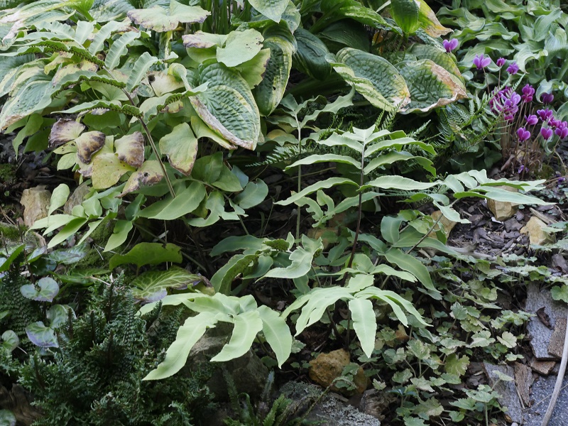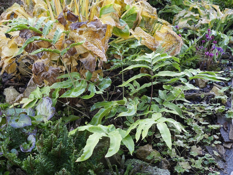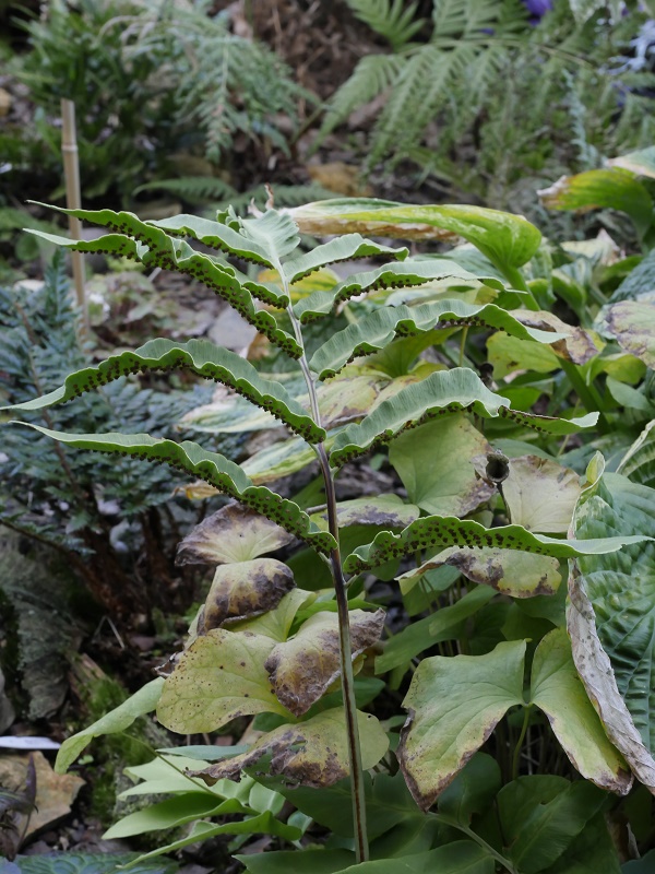 Nerecznica Siebolda wznowiła wegetację jako jedna z ostatnich paproci w ogrodzie, ale jeden liść chyba został muśnięty przymrozkiem, bo w miejscu czubka była tylko mała brązowa zaschnięta kulka.