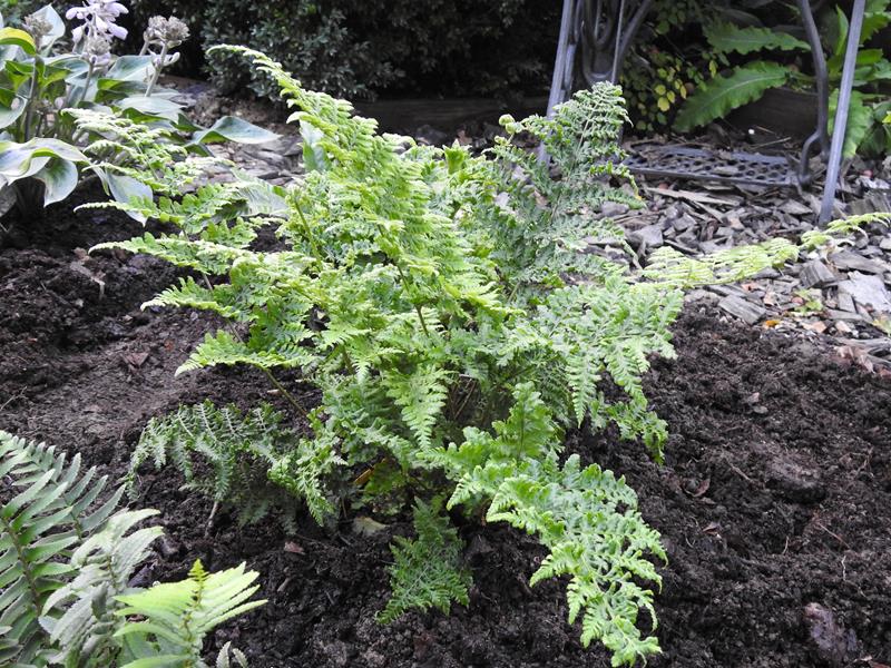 Moja 'Crispa Whiteside' także ruszyła, nawet dośc dawno. To, że rosnie osłonieta z każdej strony, uchroniło ja od uszkodzeń majowymi przymrozkami. Stanowisko zrobiło się bardzo ciasne, cięzko wyłowić i odróżnić jedną paproć od drugiej, więc czas na przenosiny.