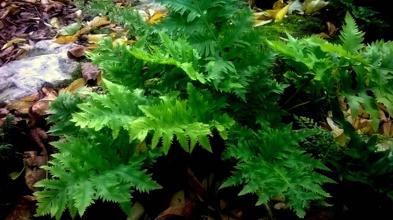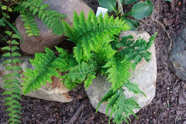 Paprotka 'Richard Kayse' , jak inne paprotki walijskie, dość późno się pokazała i dopiero teraz się rozkręca na dobre. Jedna z kępek rośnie w mocnym cieniu Polypodium interjectum i prawie wcale nie przyrosła, zdrobniała. Widać ją w lewym, górnym rogu zdjęcia.Tak ta paproć reaguje na brak słońca.