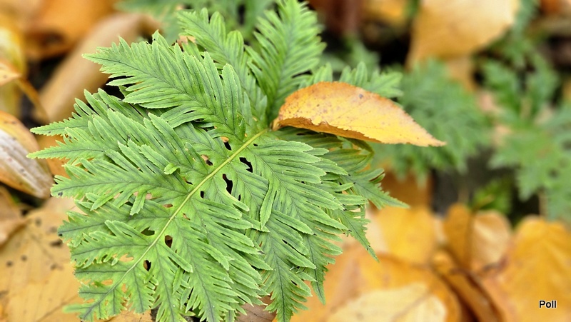 Jedna z kępek paprotki 'Richard Kayse' jest już niemal całkowicie zasypana liśćmi. Tak właśnie będzie zimować.