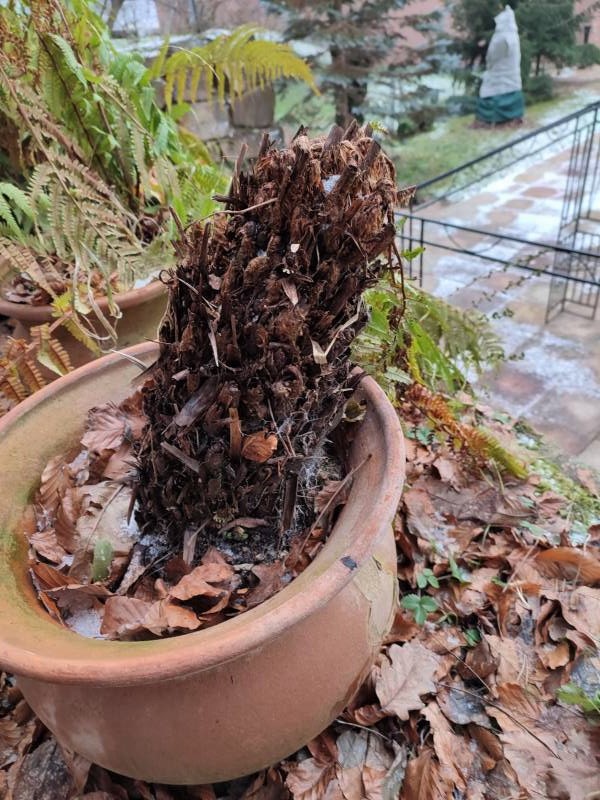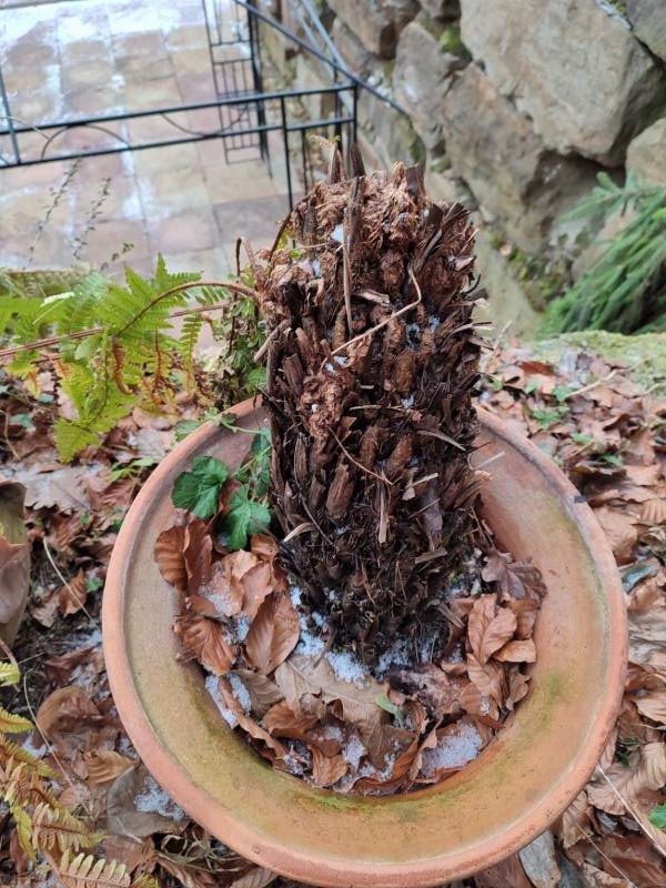 D. affinis with stem-like rhizome was planted separately into a pot, which is apparently too small, likely causing stress to the plant. Yesterday i went to the garden in Graz to watch how the palm and ferns did grow. Trachycarpus was hidden by it's winter-coating, the ferns in wood-containers doing quite well. The D. cf. borreri with stem looks good, despite the leaves seem to have been removed. As i saw, the upright rhizome grew side crowns in addition to the larger, apical one.