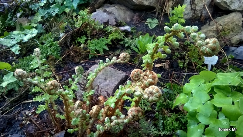 Odmiana paprotnika szczecinkozębnego 'Tripinnatum' to młoda, drugoroczna paproć. Na stanowisku ze wschodzącym słońcem posadziłam ją ubiegłej jesieni. Zimne noce i długotrwałe przymrozki opóżniły jej start ale nie zahaczyły