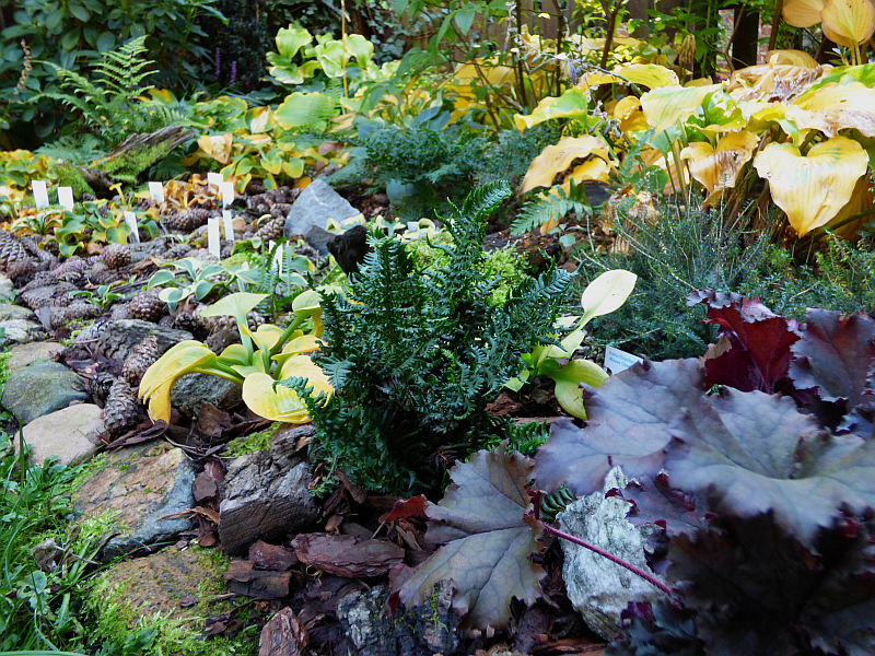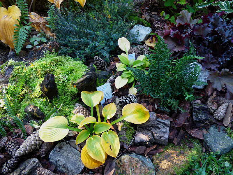 W najbliższym sąsiedztwie rosną żółto ulistnione hosty 'Giantland Sunny Mouse Ears' i 'Giantland Mouse Cheese'