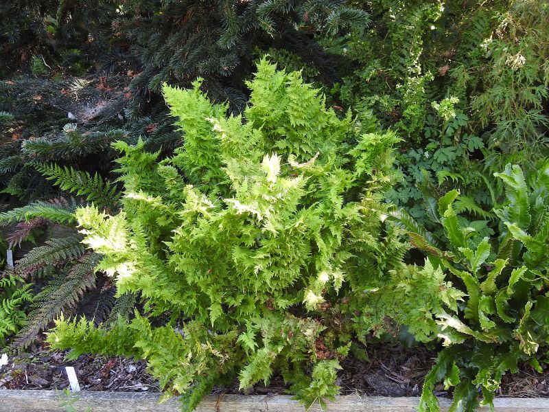 Inny egzemplarz wietlicy 'Plumosum Congestum' z większą ilością słońca. Wypuścił w tym sezonie bardzo duże liście. Z prawej strony odmiana 'Dre's dagger'