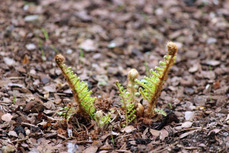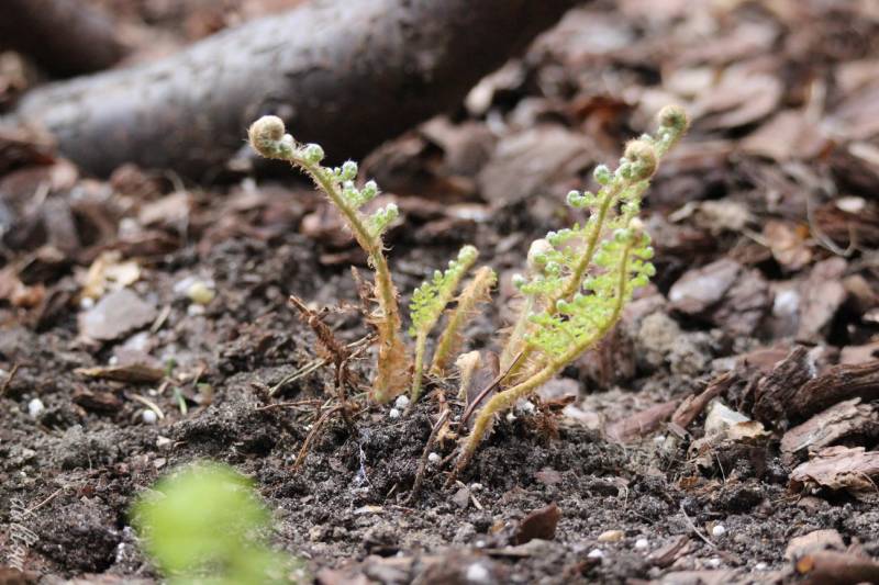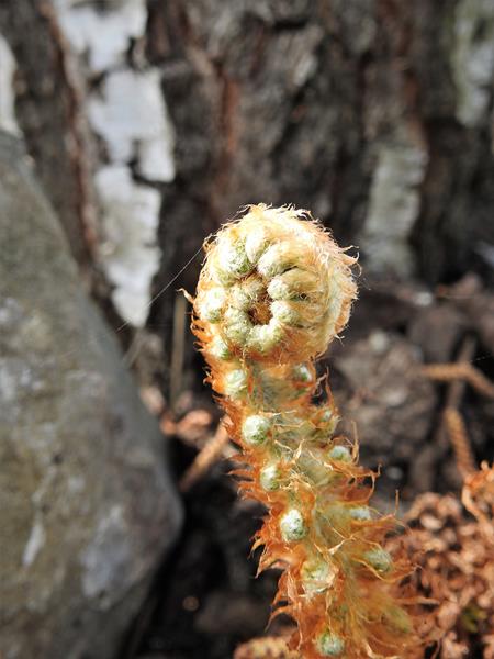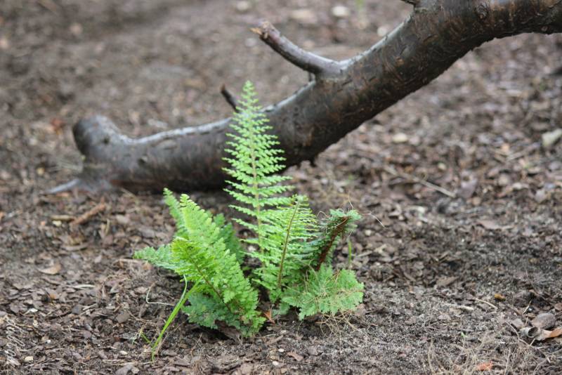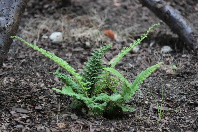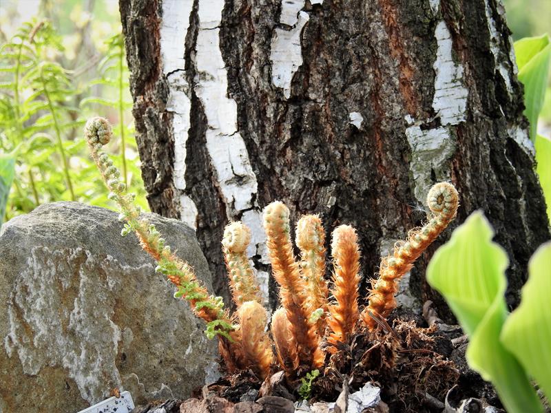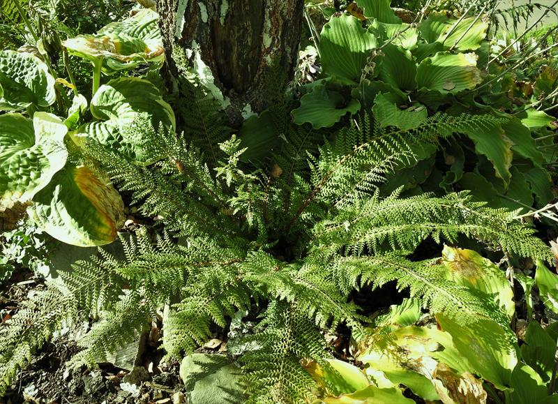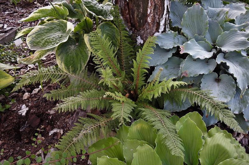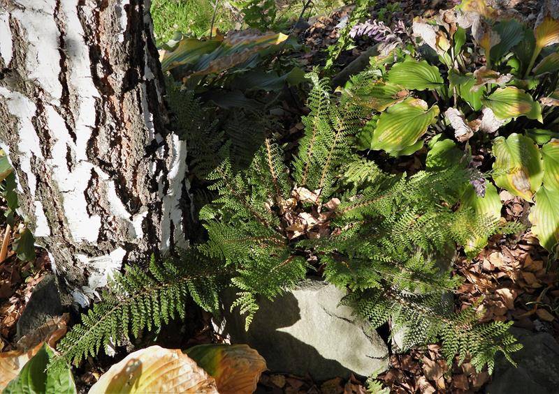 Polystichum setiferum 'Laxum' całkiem dobrze sobie radzi przytulony do pnia brzozy.