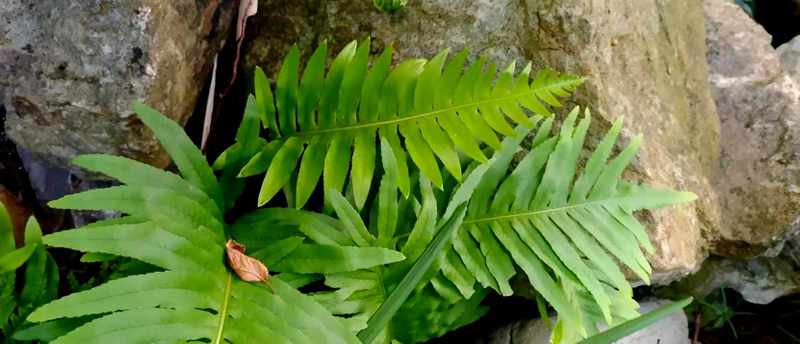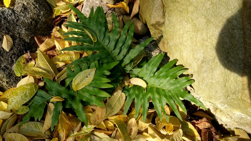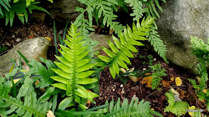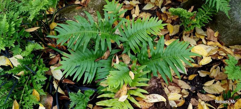 Polypodium cambricum 'Oxford Gold' dwa lata temu weszło kłączem pod kamienie i w tej chwili wybija tylko z tego miejsca. Górna, głowna część prawdopodobnie obmarzła