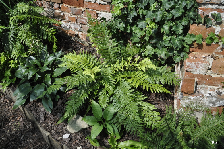 Mój egzemplarz Polystichum microchlamys rośnie pod murem, na dość gorącym stanowisku. Mimo, że ziemia jest wilgotna, nie ma wzniesionego pokroju, pokłada się frondami po ziemi