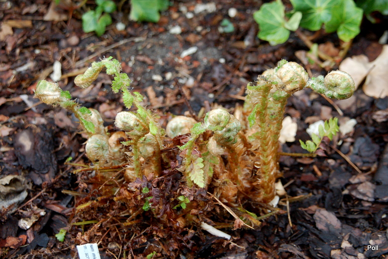 Polystichum microchlamys nie stracił w wyniku przemrożenia tylu pastorałów, co Polystichum retrosopaleaceum ( na fotce, po prawej) i spokojnie się rozwija