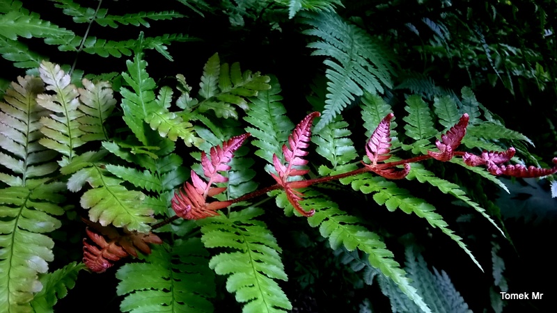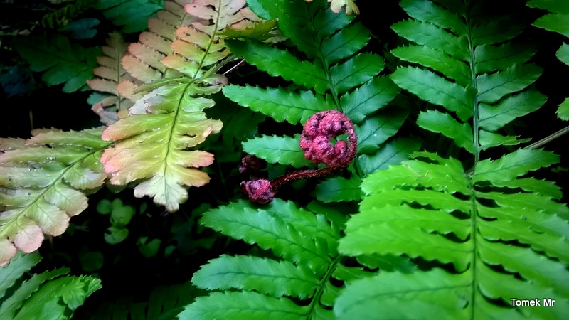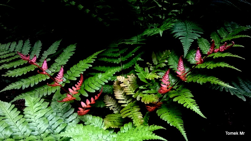 Jeden z moich Dryopteris purpurella pławi się w popołudniowym słońcu na szczycie stoku paprociowego. Trafiła tam właśnie ze względu na rozmiar- jest sporą paprocią