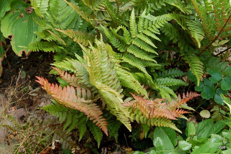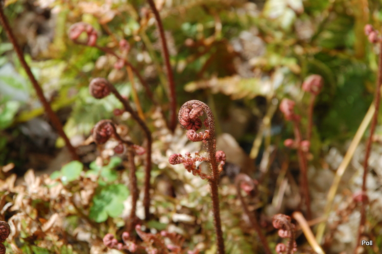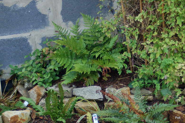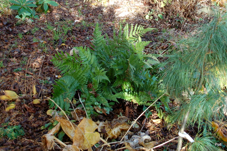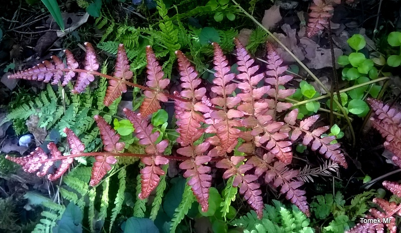 Młodszy egzemplarz Dryopteris purpurella rośnie na bardzo mocno osłoniętym stanowisku ( tuż pod murem), więc w ogóle nie nosi śladów uszkodzeń od przymrozków. Po lewej, nadal ładnie zielone Disporum megalanthum.