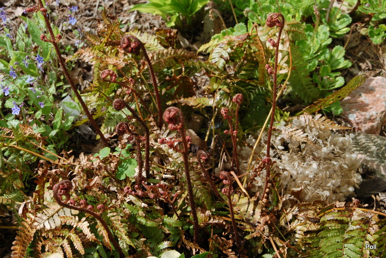 Przyznam, że miałam wyrzuty sumienia, bo jesienią zapomniałam o tej nerecznicy i zimowała całkowicie bez zabezpieczenia. Nic sie nie stało jednak i Dryopteris purpurella ładnie wystartował w nowy sezon