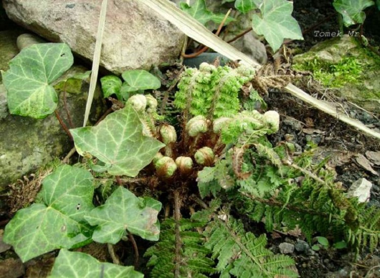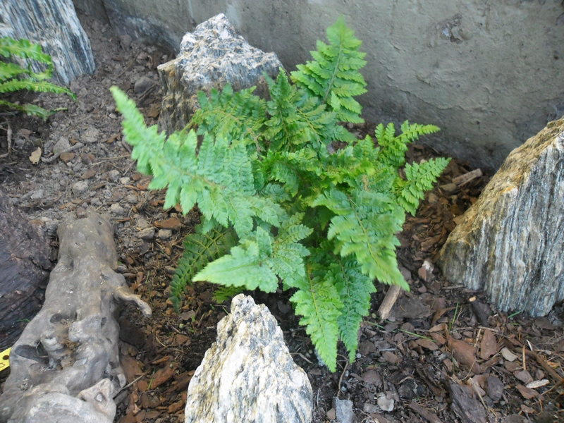 Jest jeszcze malutki, posadzony wiosną 2015. Wygląda na mocną paprotę i mam nadzieję, że nie będzie grymasił na temat odczynu gleby /podsypuję dolomitem, ale odrobinkę tylko, bo obok rosną azalie/.