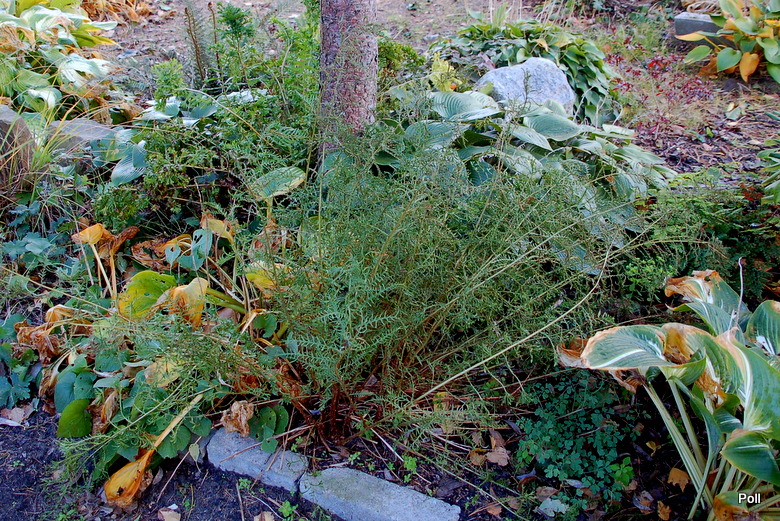 Nerecznice męskie (Dryopteris filix-mas) sa mniej trwałe od nerecznic mocnych (Dryopteris affinis), więc jesienne wiatry, mocniejsze deszcze i przymrozki szybko pozostawiają na nich swoje piętno(wyłamane frondy). Tak jest tez z odmianą 'Linearis Polydactyla', która o tej porze roku nie jest zaschnięta (we wszelkich szkołach uczą, że jest paprocią zimozieloną przecież i część zielonych liści dotrwa do wiosny), ale walorów ozdobnych, to już ona nie ma, niestety.