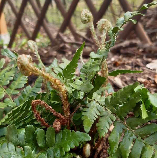 Dryopteris championii przyszła w paczce z sadzawki w piątek. Dziś wsadziłam ją na podwyższoną rabatkę do ziemi gliniastej z dużą ilością ziemi liściowej. Nie wiem czy nie za wcześnie dałam ją do ogrodu, ale na razie przymrozków nie zapowiadają.