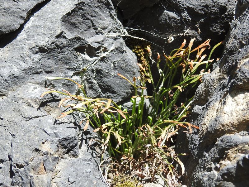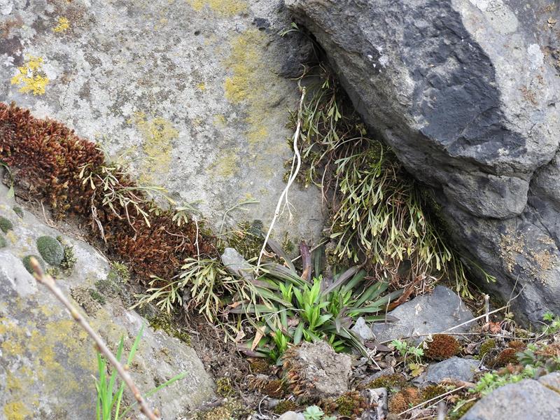 Asplenium septentrionale rośnie tam na zasadowych, bardzo suchych stanowiskach, we wgłębieniach bazaltowych skał niemal w pełnym słońcu . Szukałam jej w cienistej części masywu poniżej szczytu, ale bezskutecznie. Tylko na samej koronie, w olbrzymich blokach skalnych znalazłam kilka stanowisk