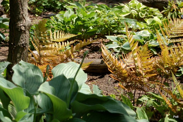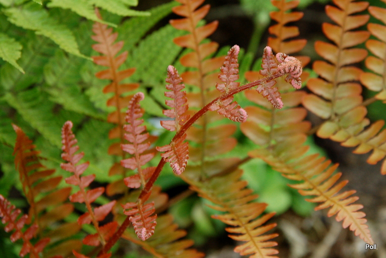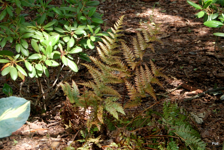 Wydaje mi się, że nie powinna być sadzona w bardzo głębokim cieniu, bo wtedy nie wybarwia się tak jaskrawo. Mam dwa egzemplarze nerecznicy czerwonozawijkowej pod dębem, gdzie promienie słoneczne niemal nie dochodzą i są one bardziej bardziej stonowane w kolorach. Młode przyrosty są oczywiście rude, ale liście bardzo szybko tracą ten kolor i zielenieją