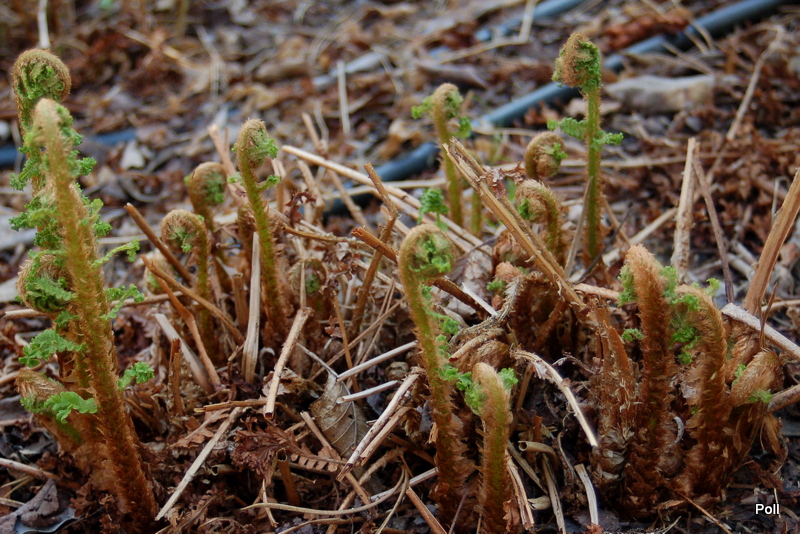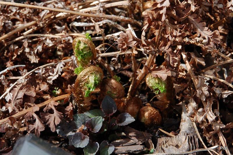 'Parsley' nieśmiało pokazuje jeszcze zwinięte pastorały. Wiosną, ich stanowisko jest mocno cieniste, więc nie spiesza się ze startem.