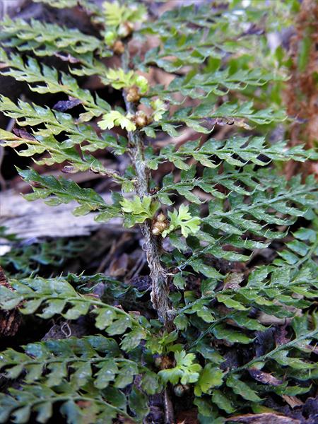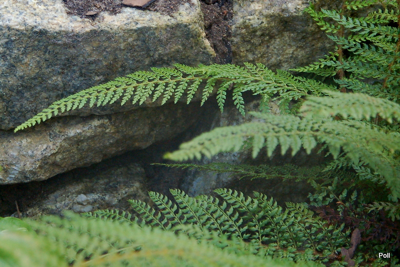 Paprotnik szczecinkozębny 'Proliferum Gracile' na wilgotnym, półcienistym stoku paprociowym.
