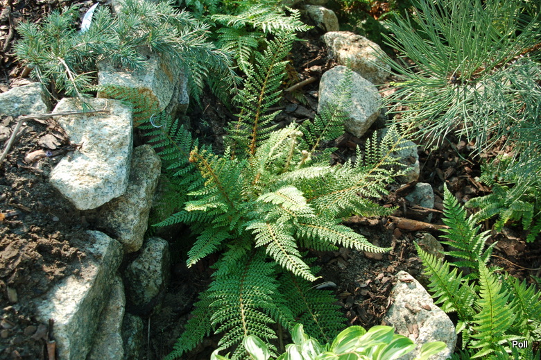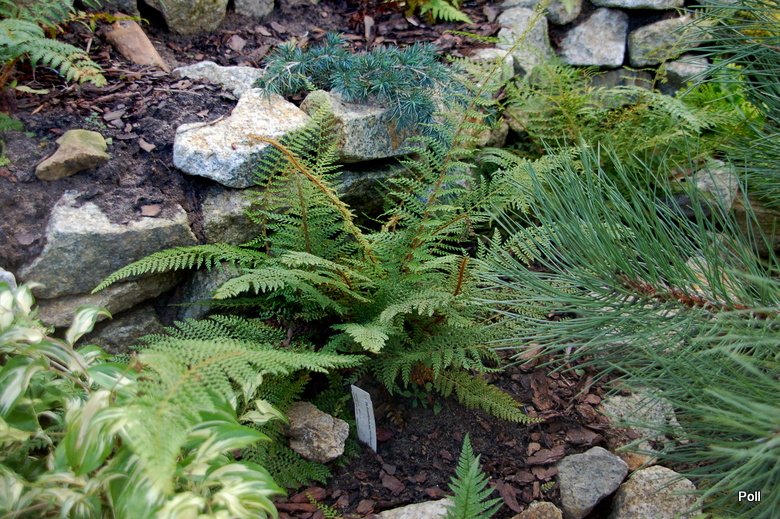 Paprotnik szczecinkozębny 'Proliferum Gracile' wznawia wegetację. Stanowisko słoneczne.