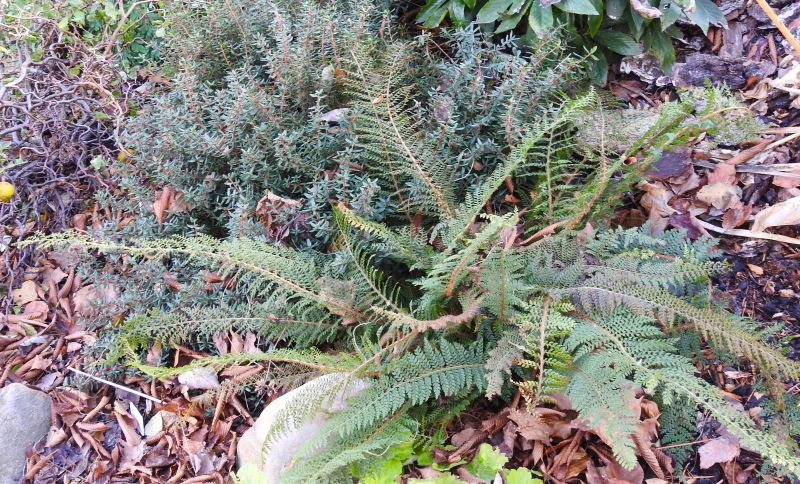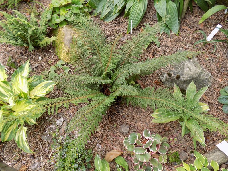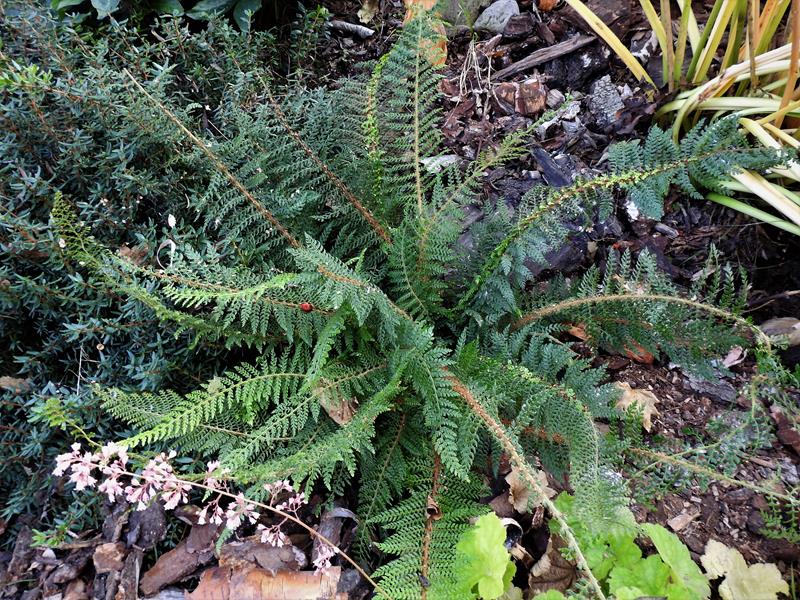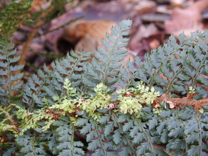 Polystichum setiferum 'Proliferum Gracile', jesienią jak zwykle wypuścił najdłuższe liście.