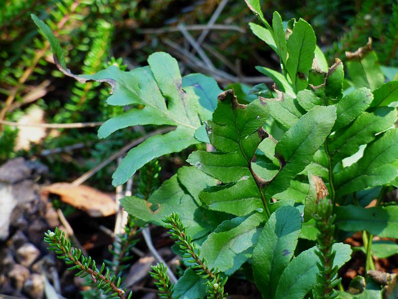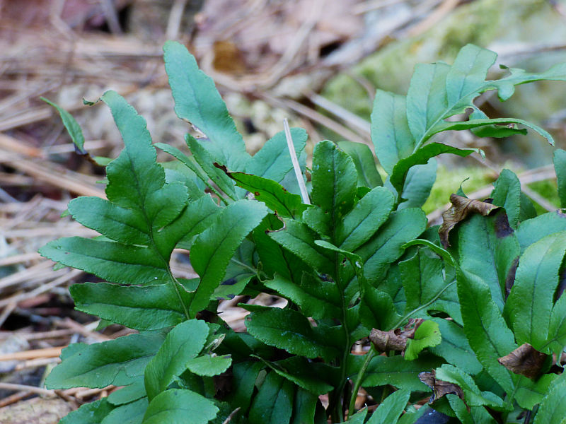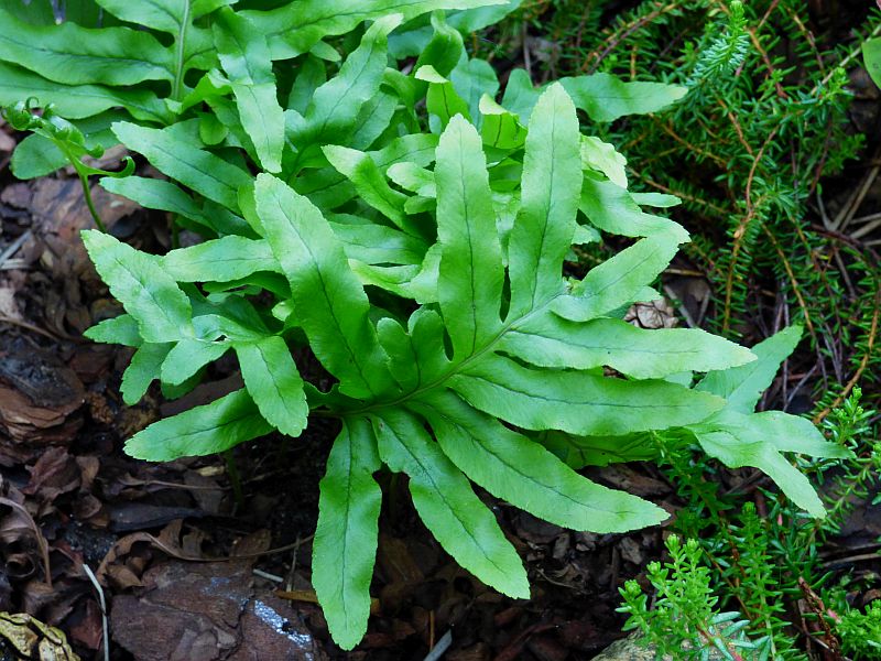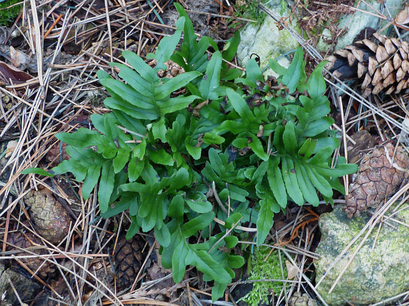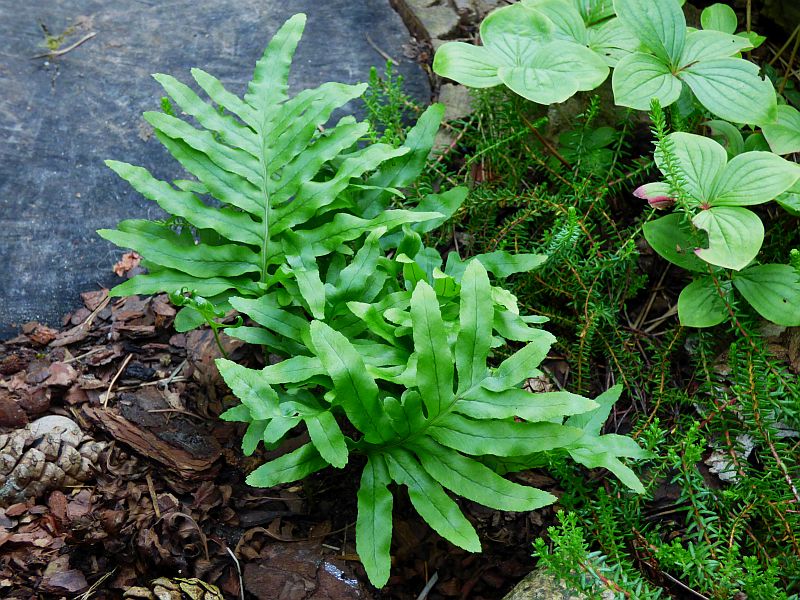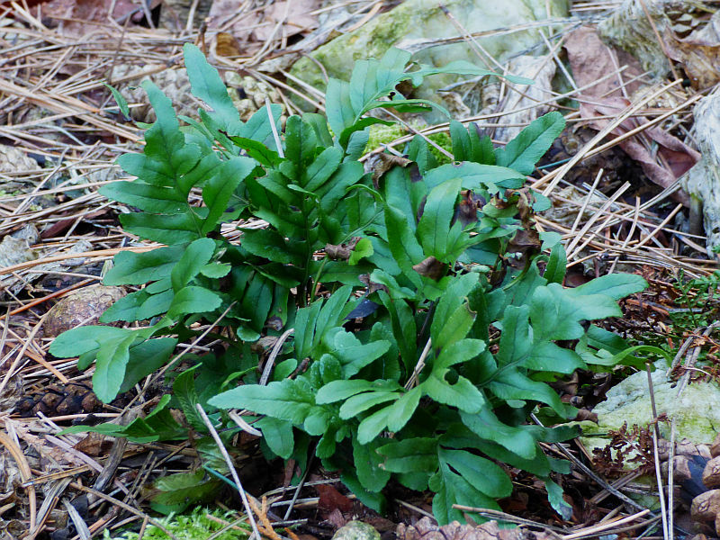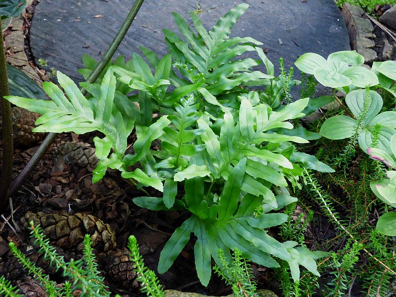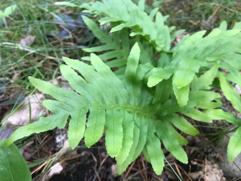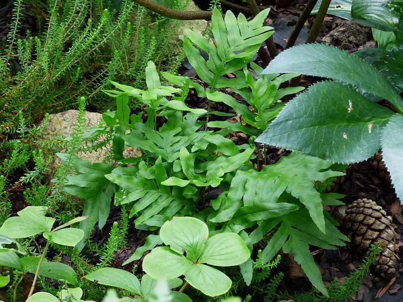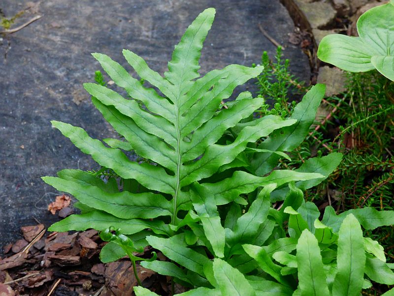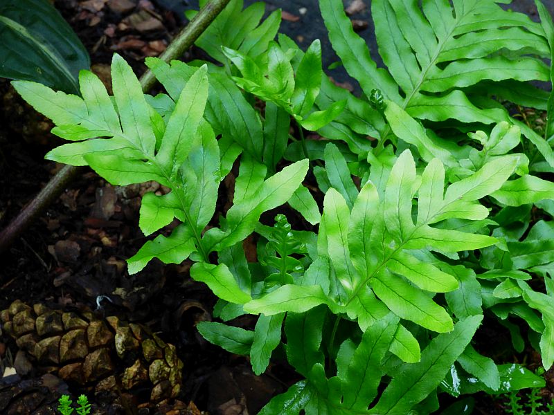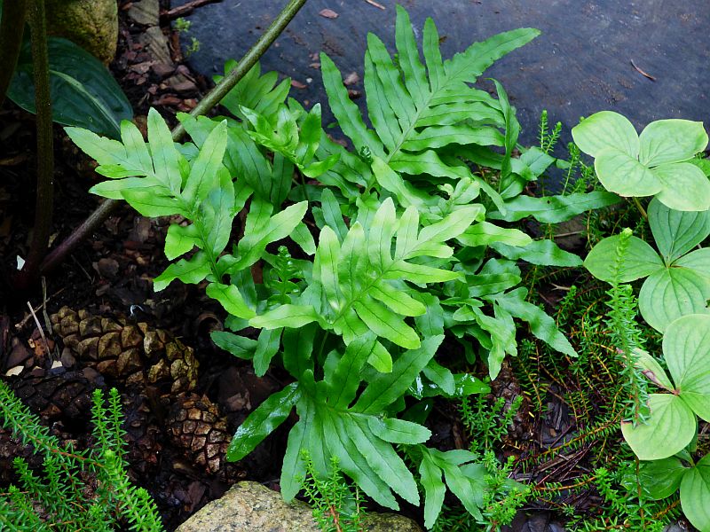 Polypodium), odmiana ta rozprzestrzenia się przez pełzające pod ziemią kłącza, z których wyrastają zimozielone, stosunkowo szerokie frondy, o