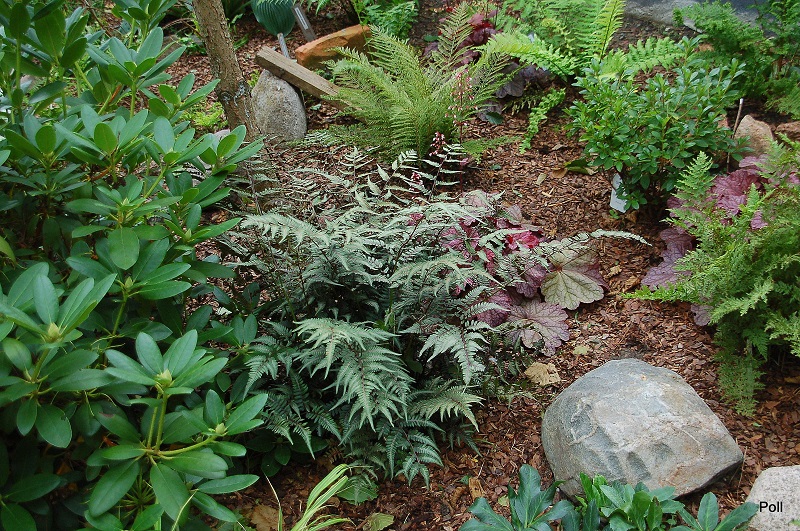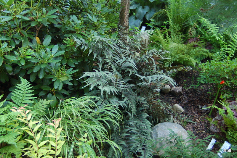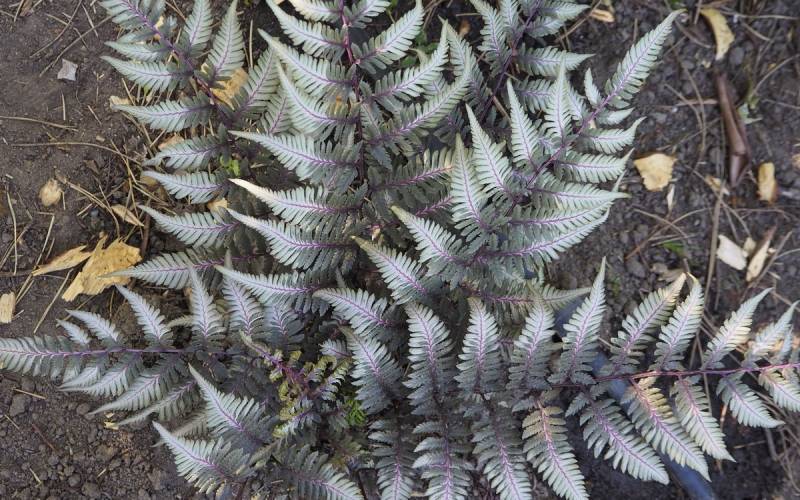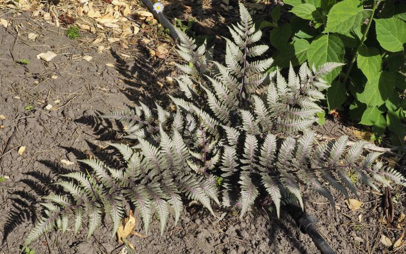 Athyrium niponicum ''Godzilla'- jedna z kęp przesadzonych na stok paprociowy. W jego dolnej części ma dość wilgoci i lekki cień.