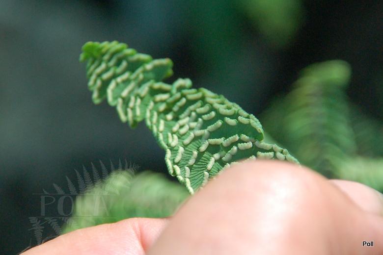 Od gatunku różni się przede wszystkim rozmiarami, gdyż nie osiąga zazwyczaj więcej, niż 10-15 cm wzrostu i z tego powodu zaliczana jest do form 'dwarf'/karłowych. Frondy o kształcie ptasiej łapki mają średnicę około 10 cm i zbudowane są z listków osadzonych na czarnych łodyżkach. Lstki są niewielkie i dość ciasno nakładają się na siebie. Zarodniki ukryte są w zawijkach położonych na ich skraju. Po dojrzeniu można je wysiewać, gdyż powtarzają cechy roślin matecznych.