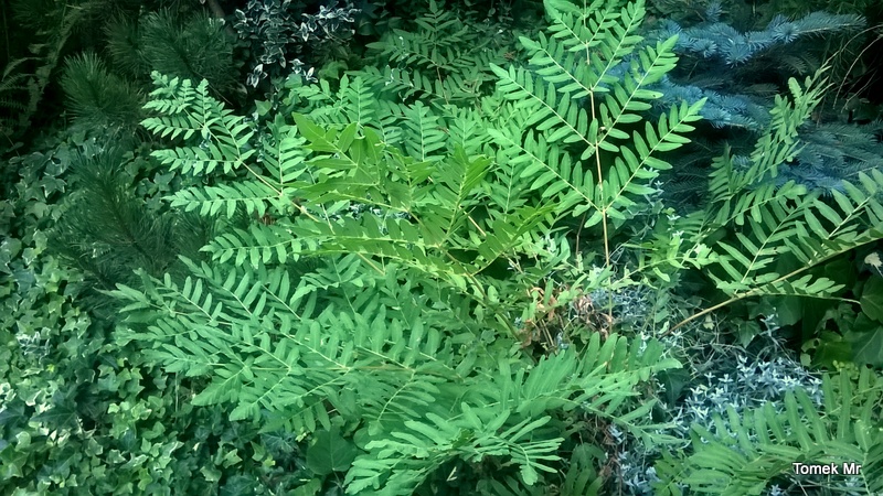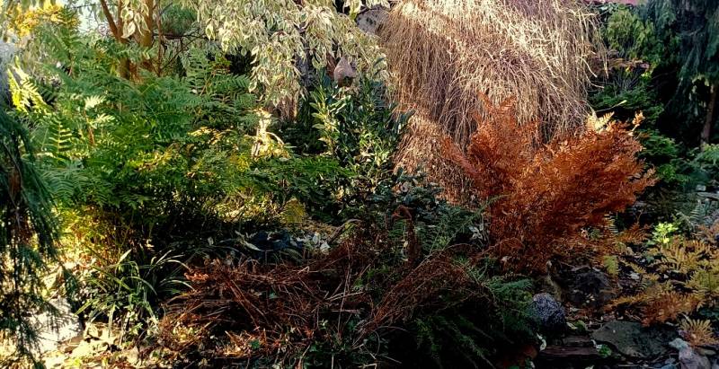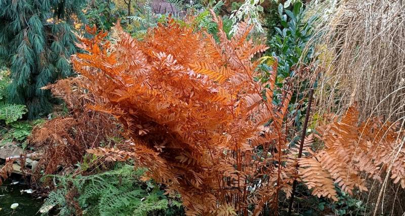 Osmunda regalis var. spectabilis , jest bliźniaczo podobny do naszego długosz królewskiego. Chociaż w tym momencie widać sporą róznicę, bo regalis jest u mnie jeszcze zieloma, a spectabilis już cała w jesiennych barwach. nie wiem czy to kwestia cechy podgatunku czy stanowiska, [iOsmunda regalis var. spectabilis] [/i] ma więcej słońca
