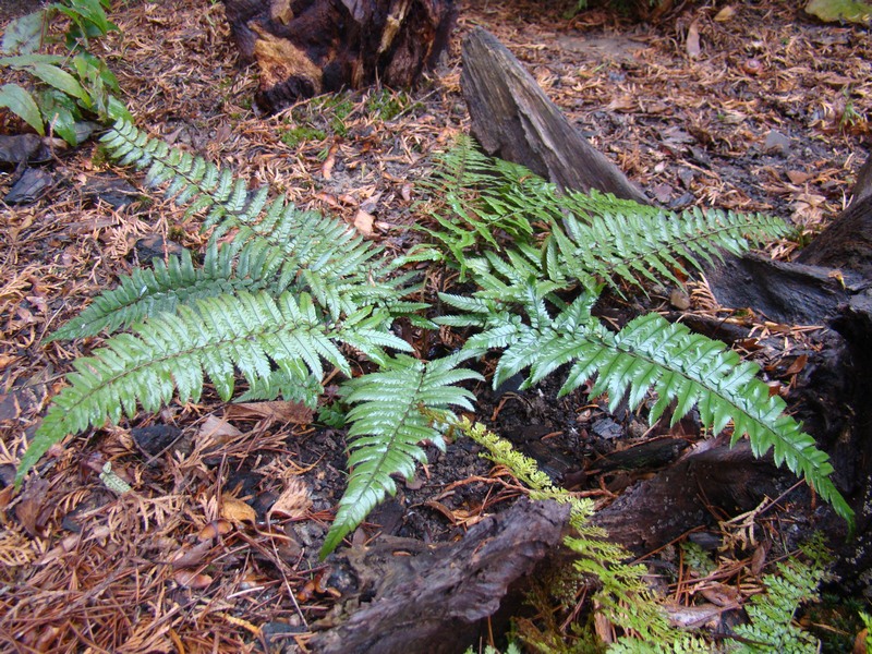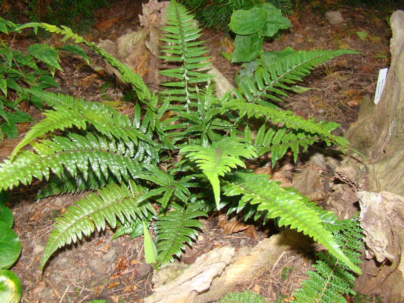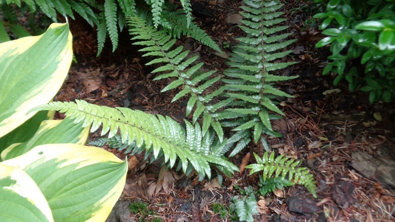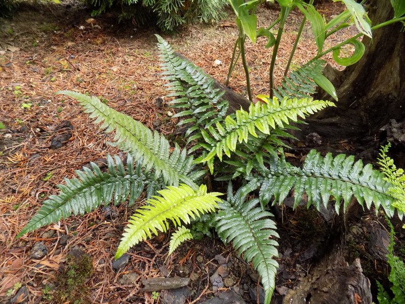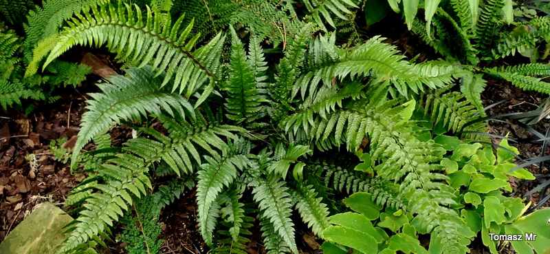 Polystichum xiphophyllum , na dwóch różnych stanowiskach. trudno uwierzyć, ze to ta sama paproć. Ta błyszcząca rośnie na bardziej suchym z popołudniowym słońcem.