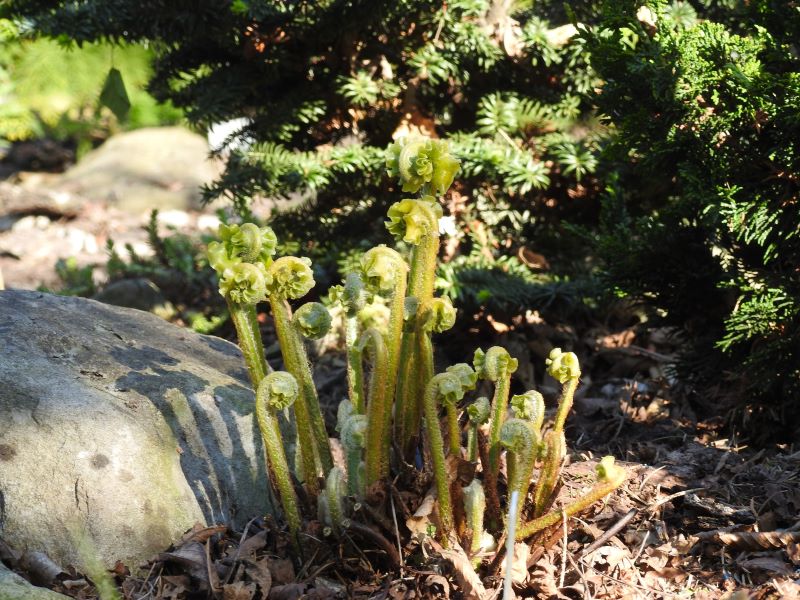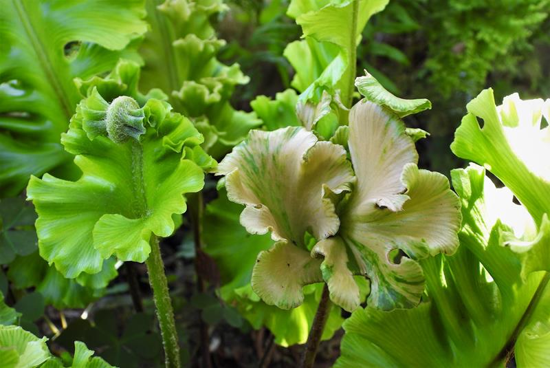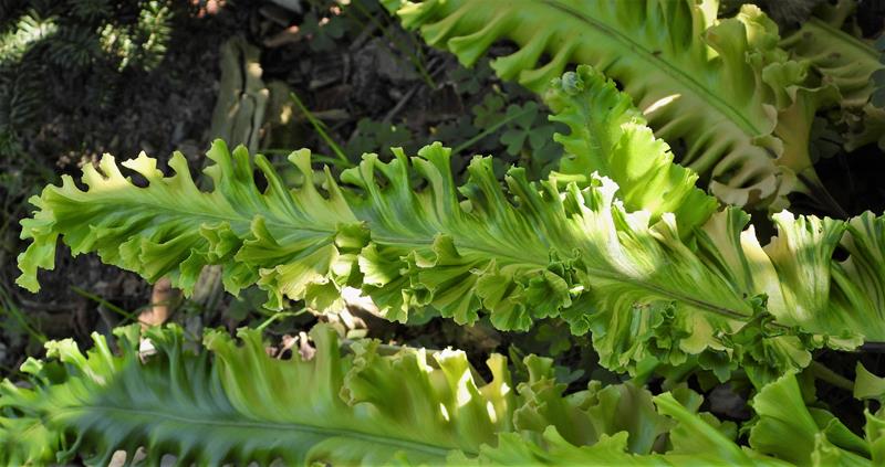 Ten egzemplarz 'Crispum Speciosum' rósł w głębokim, wilgotnym cieniu, ale wczoraj trafił na bardziej słoneczne stanowisko. Zapewne nie będzie już miał takich długaśnych frondów, ale może wytworzy więcej serc.
