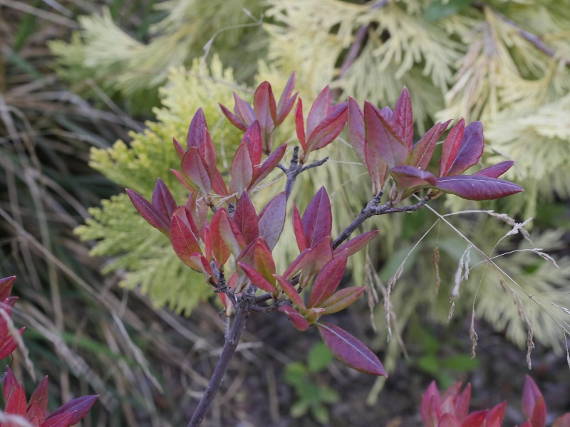 Liście: sezonowe, ciemnozielone o lekko niebieskawym odcieniu i błyszczące z wierzchu, od spodu srebrzyste