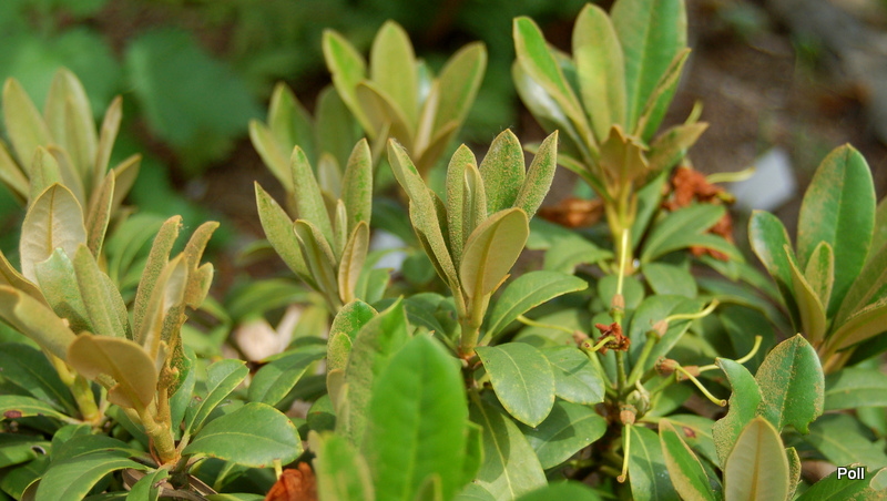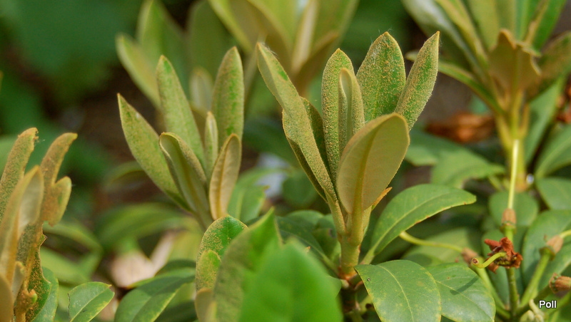 Liście: oliwkowozielone z wierzchu, od spodu pokryte gęstym, filcowanym, brązowym indumentum... eliptyczne, lekko wypukłe