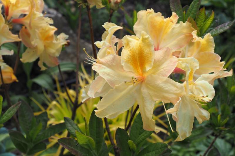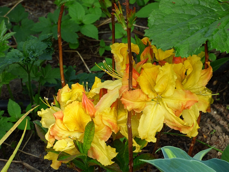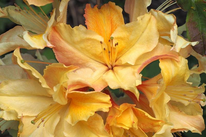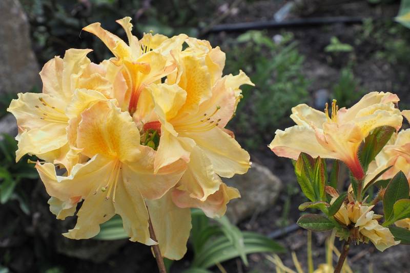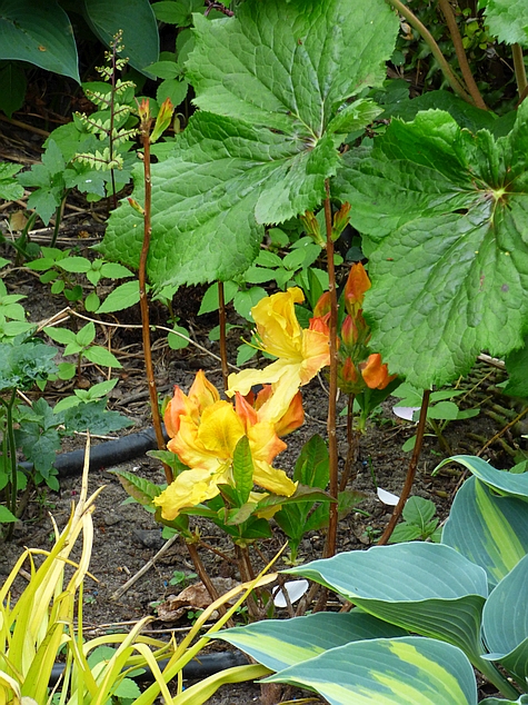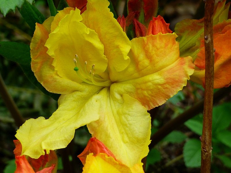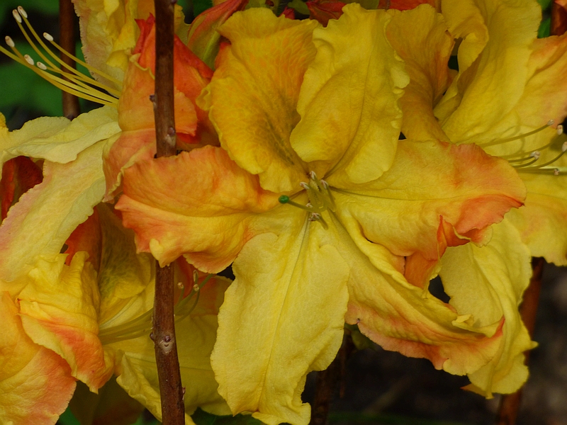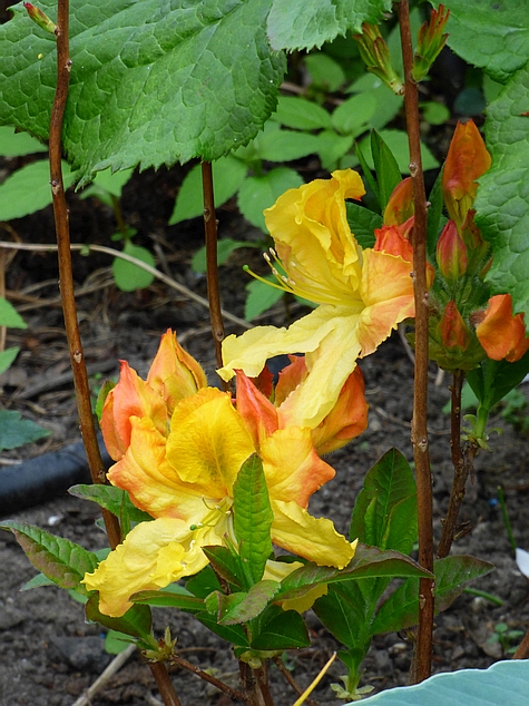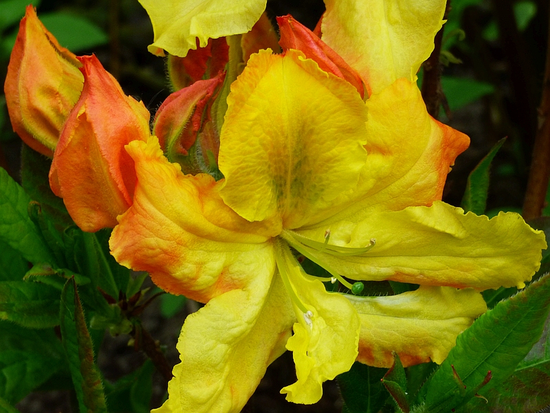Kwiaty: w pąku różowo czerwone z nutą pomarańczu, po otwarciu żółte z różowo pomarańczowymi brzegami oraz jaskrawożółtą plamką z pomarańczowymi, rzadziej