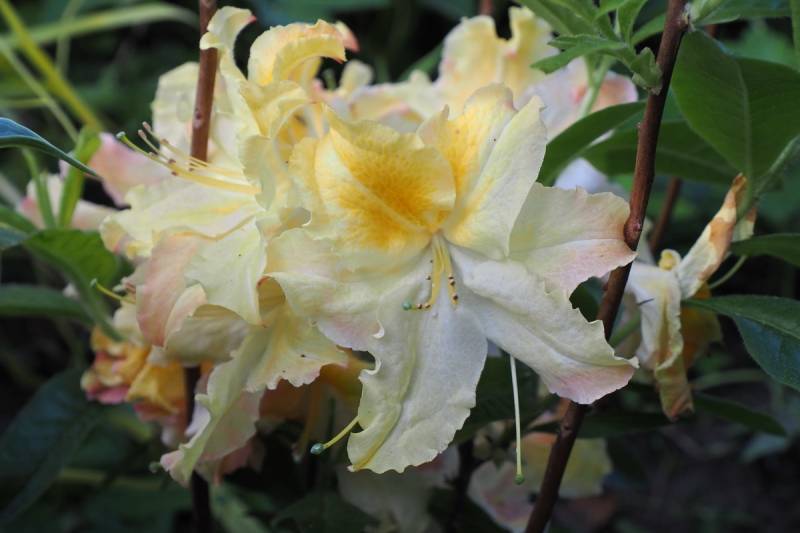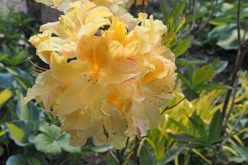 zielonkawymi cętkami na górnym płatku, na zewnątrz pomarańczowo żółte... zbudowane z 7 płatków o pofalowanych brzegach... pręciki pomarańczowo żółte z białymi i brązowymi pylnikami, słupek pomarańczowo żółty z zielonym znamieniem... szeroko lejkowate... bardzo duże, średnica pojedynczego kwiatu do 11,5 cm... zebrane po około 8-12 sztuk w kuliste, wierzchołkowe kwiatostany