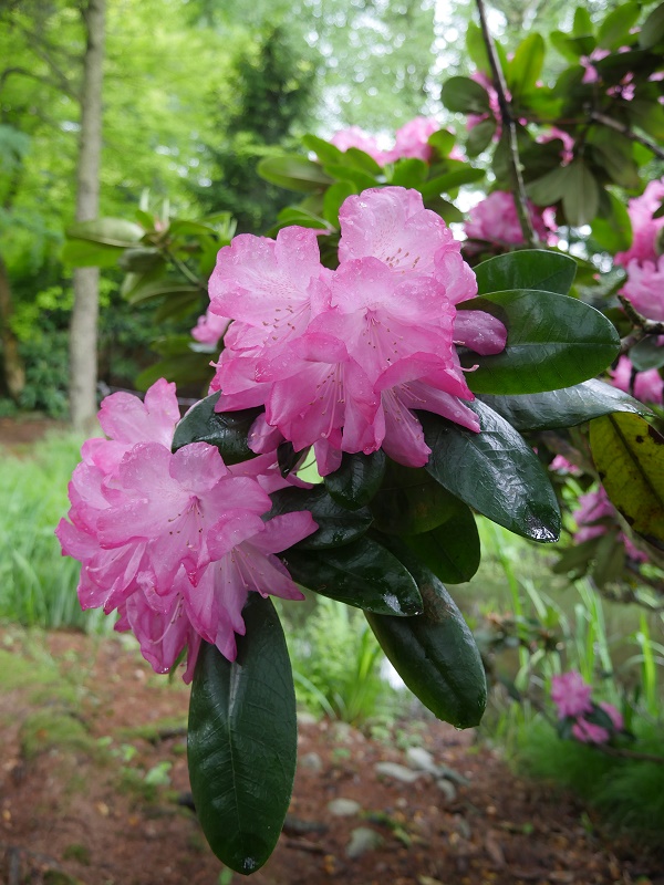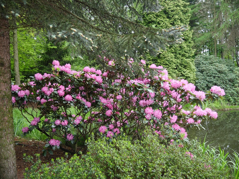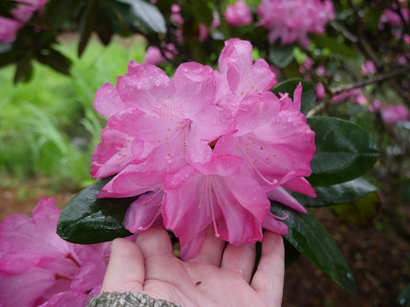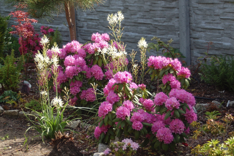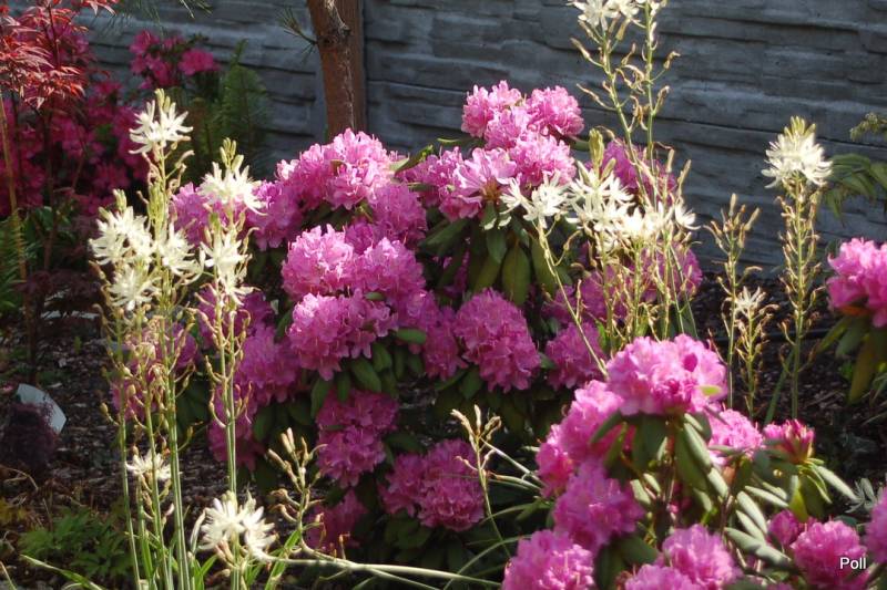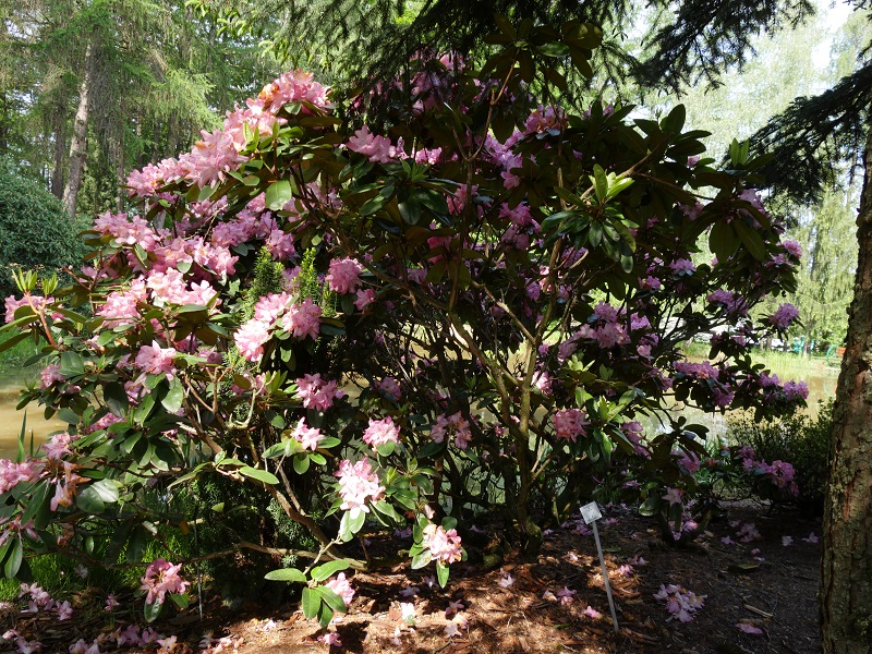 Kwiaty: w pąku ciemnoróżowe... po rozwinięciu różowe, intensywniejsze, purpurowo różowe na krawędziach i delikatnie różowe w centrum z nielicznymi, bordowymi cętkami na górnym płatku... zbudowane z 5 do 7 płatków o delikatnie pofalowanych brzegach... bardzo duże, średnica pojedynczego kwiatu od 8 cm do 8,5 cm... lejkowate z białymi pręcikami o różowych pylnikach i białawym słupkiem o czerwonym znamieniu... zebrane po około 14 sztuk w okazałe, kuliste, wierzchołkowe kwiatostany... pąki kwiatowe na zimę wybarwiają się na czerwono brązowo
