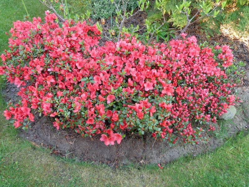 Moje azalie 'Geisha Satschico' mocno zapączkowały ...w końcu - rok po przeniesieniu na dawne dno stawu, na pełne słońce