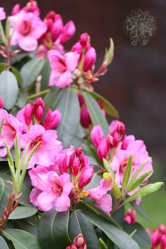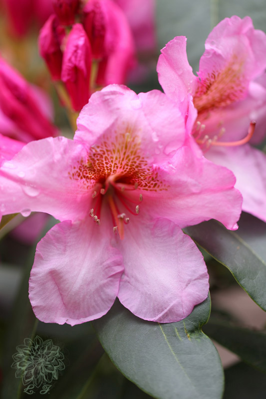 Kwiaty: w pąku różowoczerwone... po otwarciu karminoworóżowe, na brzegach nieco jaśniejsze i lekko pofalowane z licznymi cętkami zlewającymi się w wyraźną brązowozieloną plamkę na górnym płatku... lejkowate... duże, średnica pojedynczego kwiatu od 6,5 do 8 cm... zebrane po 10-12 sztuk w szerokie, płaskokuliste, wierzchołkowe kwiatostany...
