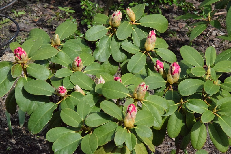 'Claudius' szykuje się do kwitnienia. Schowany za górką, nie ucierpiał od przymrozków tak, jak inne różaneczniki z grupy Williamsianum