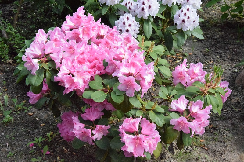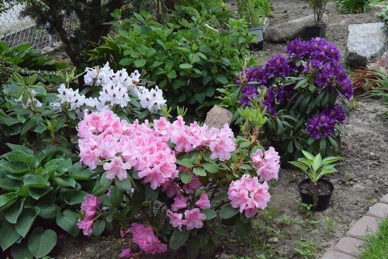 W tej chwili kwitną dwa posadzone obok siebie różaneczniki z tej grupy - Claudius i Imerlies. Rozkwitły o jednym czasie i oba nie wyglądają zachęcająco.