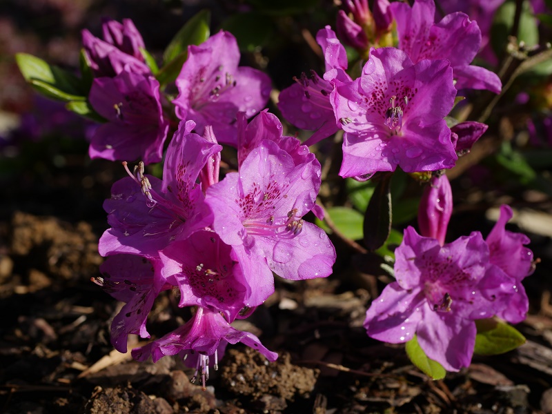 Kwiaty: w pąku ciemnopurpurowe, po otwarciu purpurowofioletowe z wyraźnymi, winnoczerwonymi cętkami na górnym płatku... szerokodzwonkowate... dość duże, średnica pojedynczego kwiatu od 4,2 do 4,8 cm... liczne, zebrane po 2-5 sztuk w płaskokuliste kwiatostany gęsto pokrywające całą roślinę