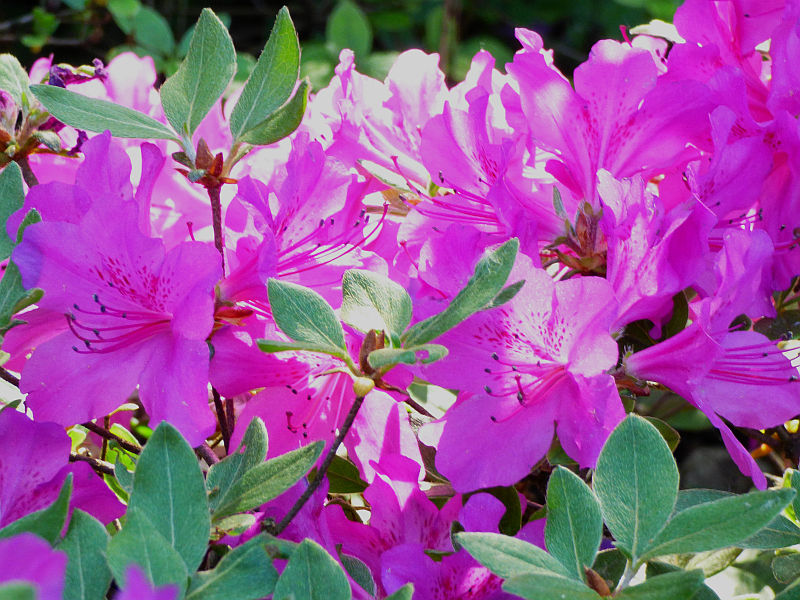 Nie mniej ozdobne są liście tej odmiany azalii... Wiosną ciemnozielone z lekkim jaśniejszym nalotem, ale jesienią nagle rozpalają się wachlarzem barw od czerwieni po brązy. Są jednak nietrwałe, na zimę zostaje ich niewiele.
