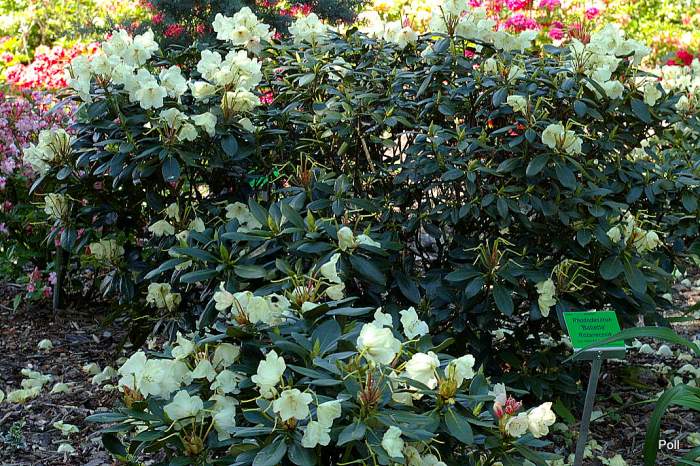 Dorosły różanecznik 'Babette' niestety już w stanie przekwitania w Arboretum w Wojsławicach