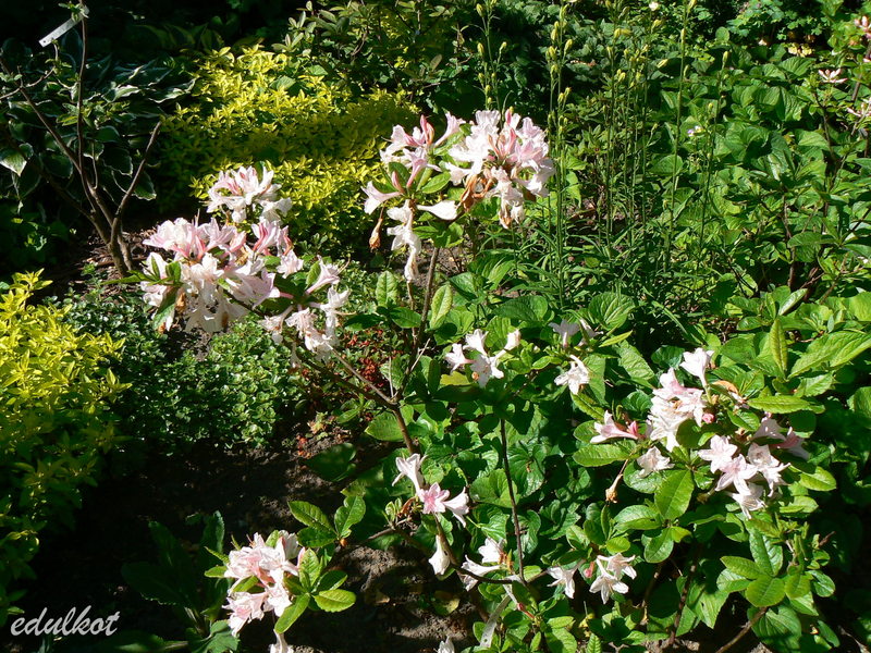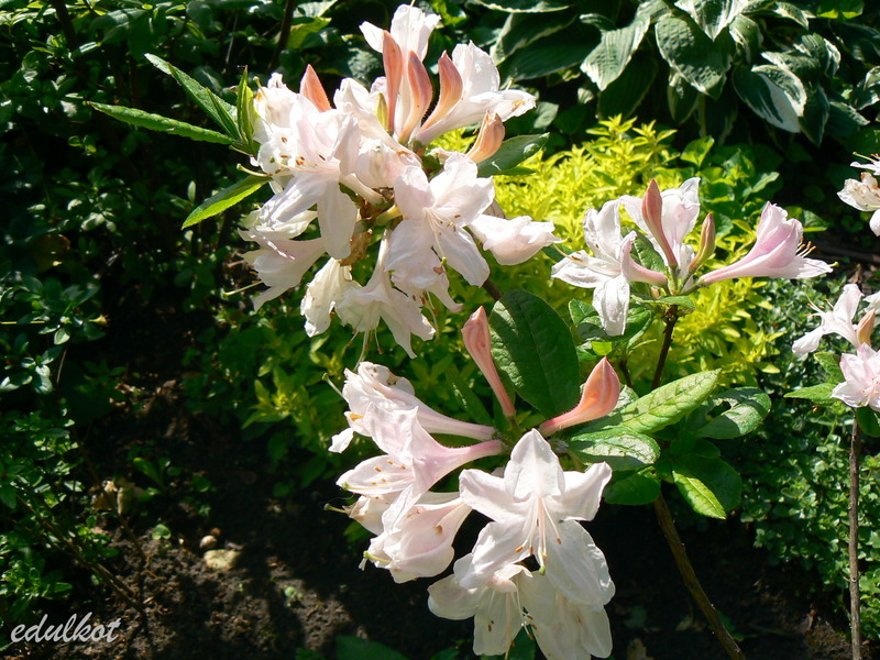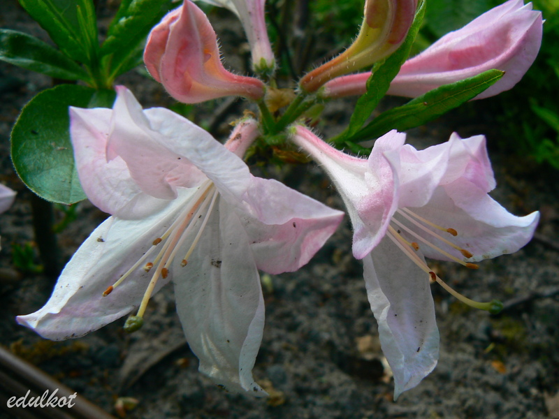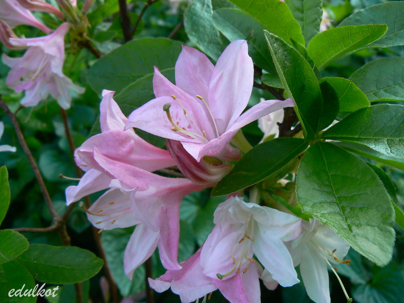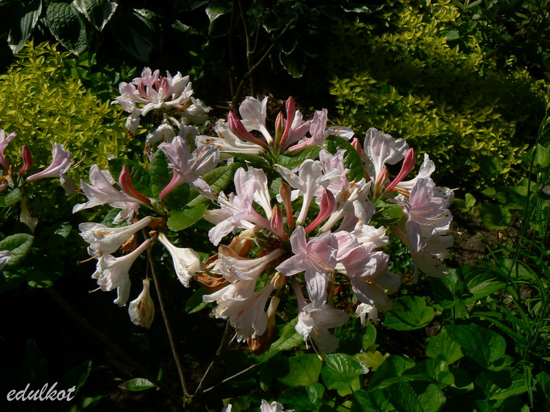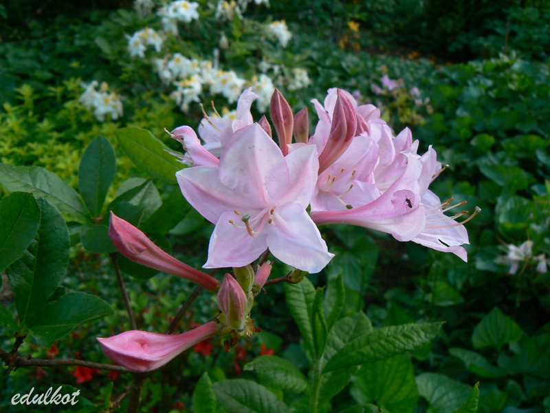 Kwiaty: w pąku różowe, po rozwinięciu bladoróżowe ze słabo zaznaczonymi, ciemnoróżowymi cętkami na górnym płatku... lejkowate... średnica pojedynczego kwiatu około 4,5 cm... zebrane po 6-8 sztuk w wierzchołkowe kwiatostany