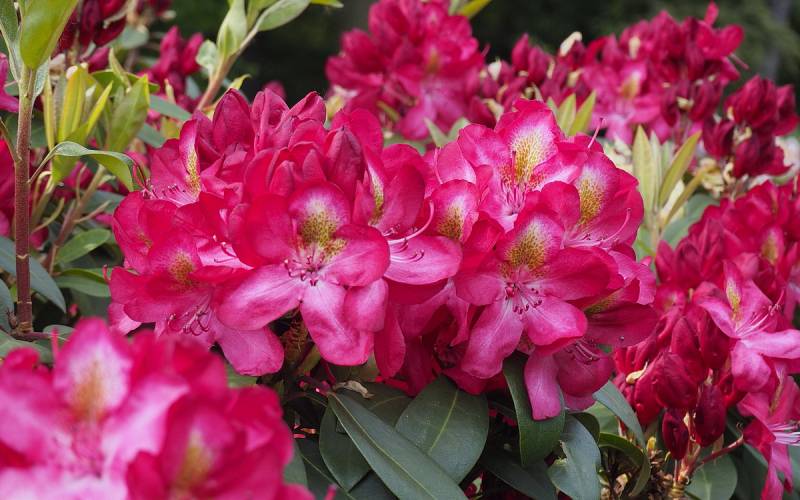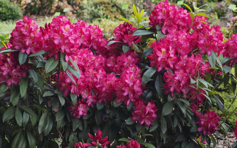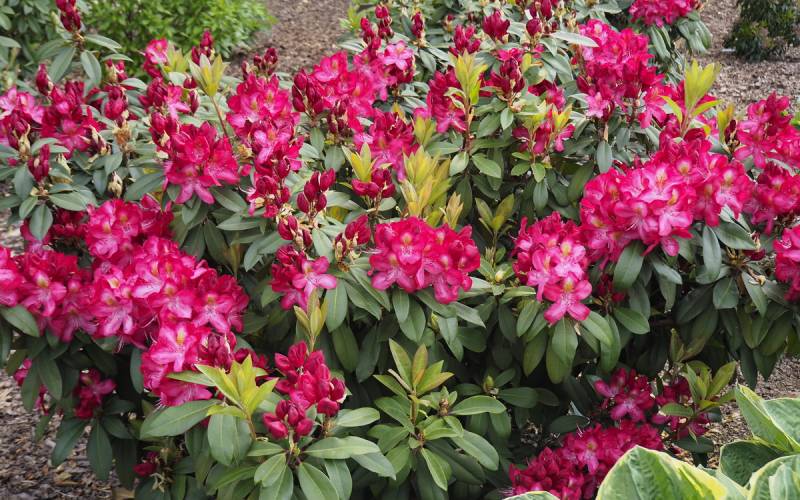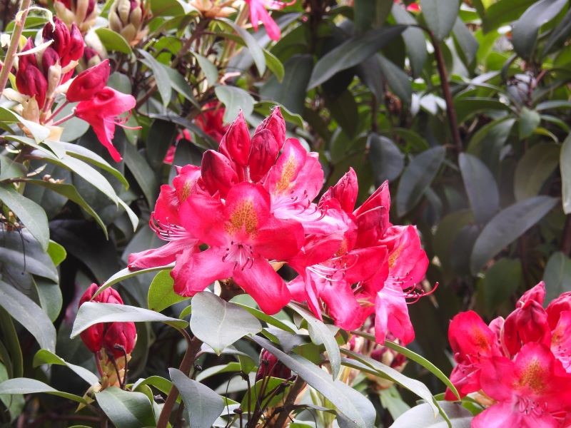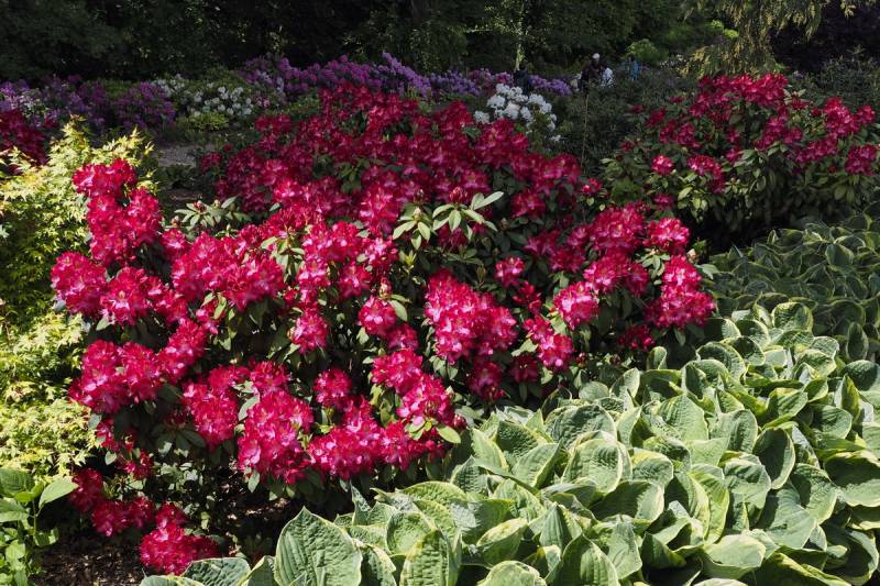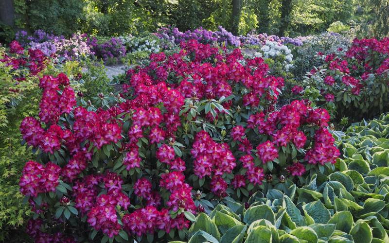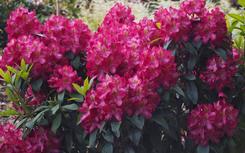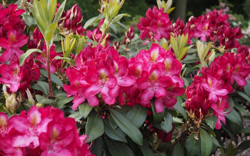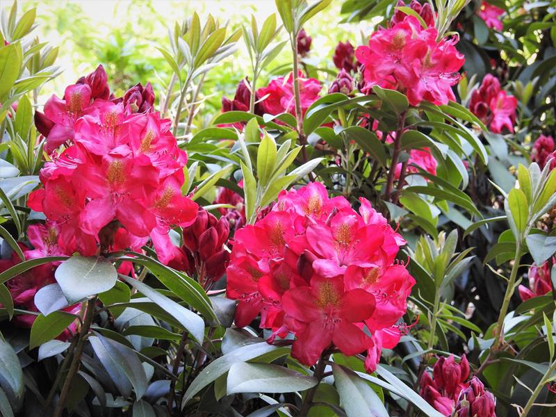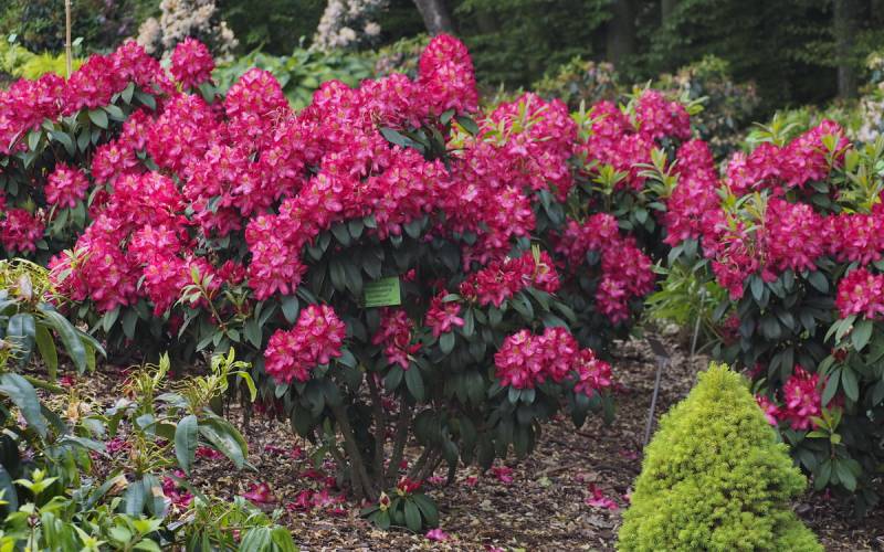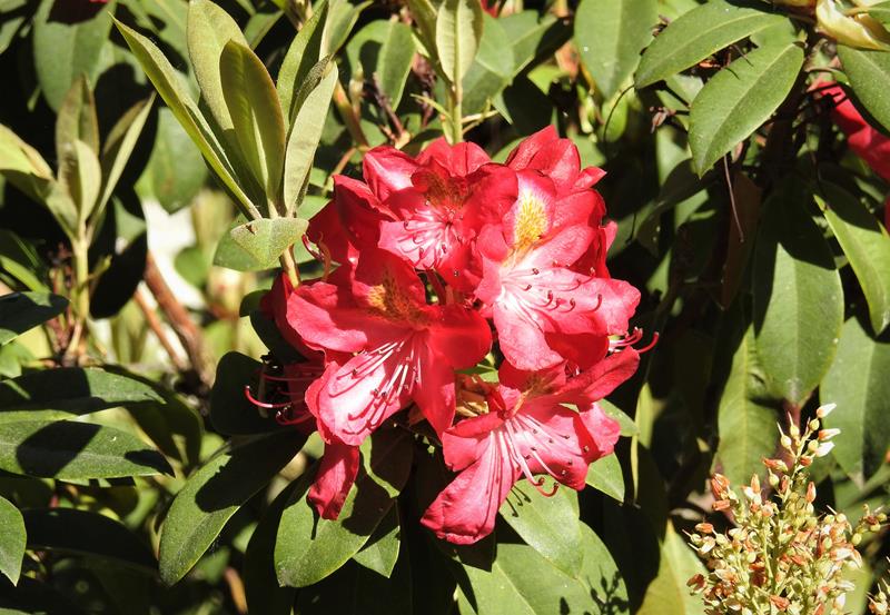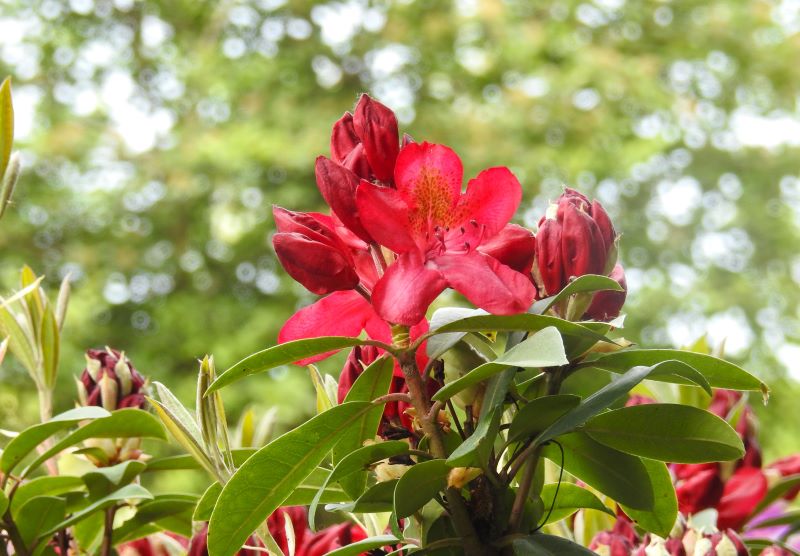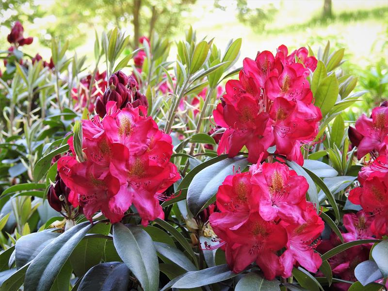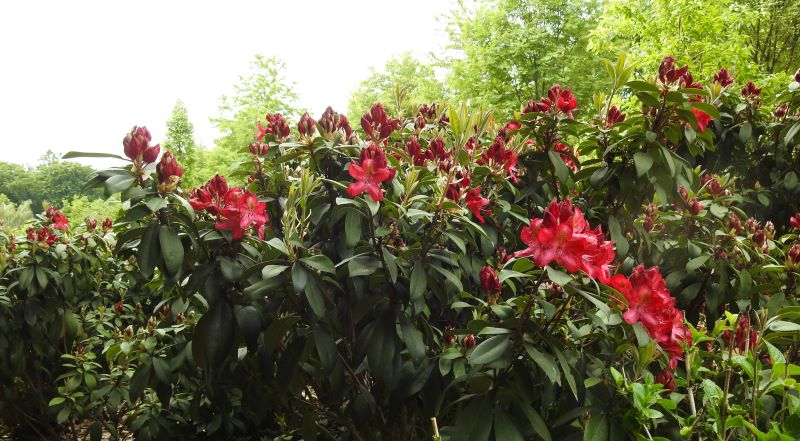 Rhododendron Junifeuer, jego ogniście czerwone kwiaty już z daleka rzucają się w oczy.