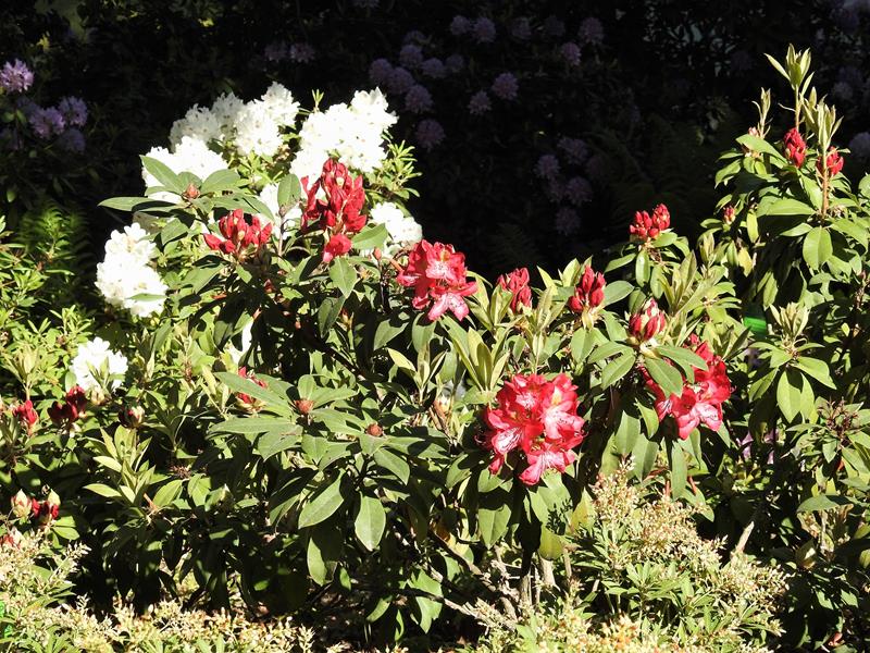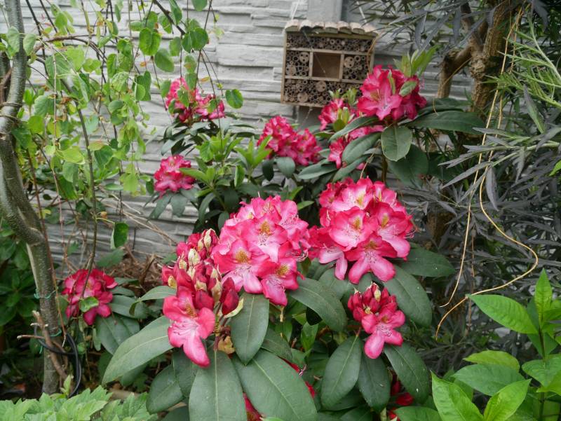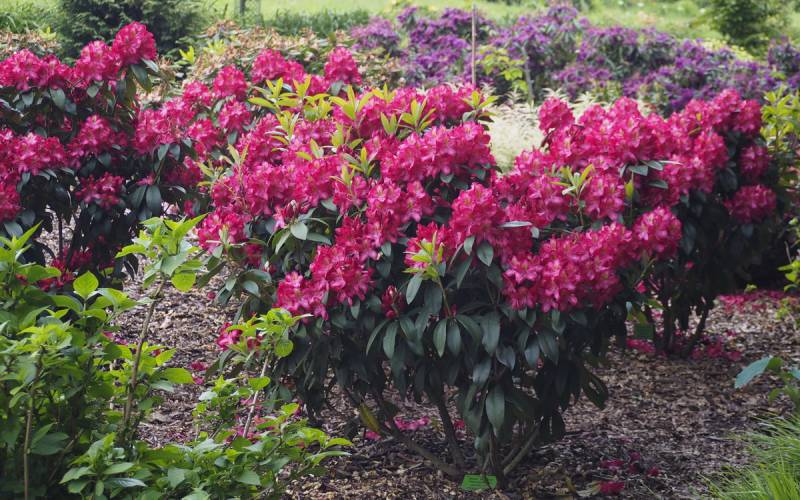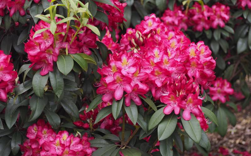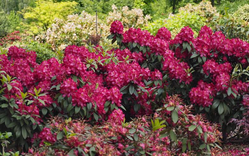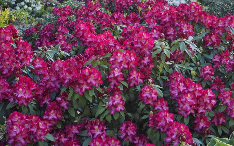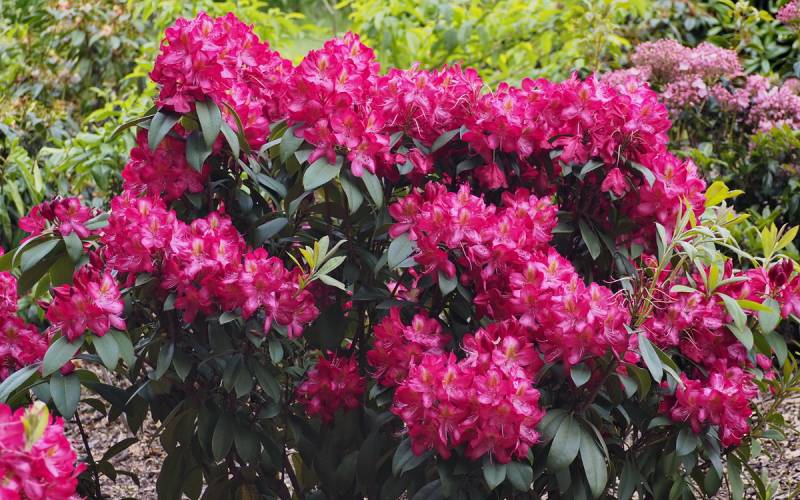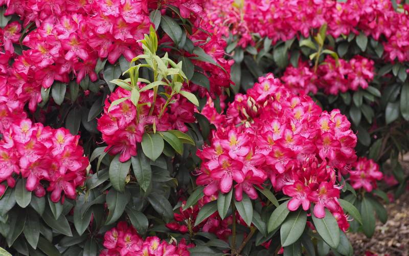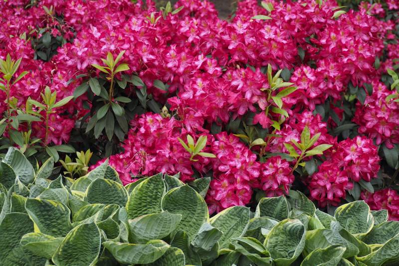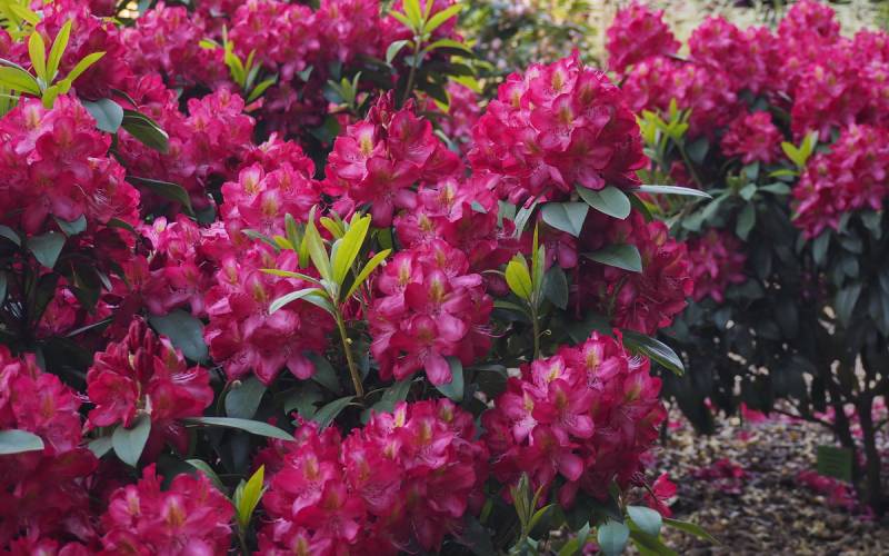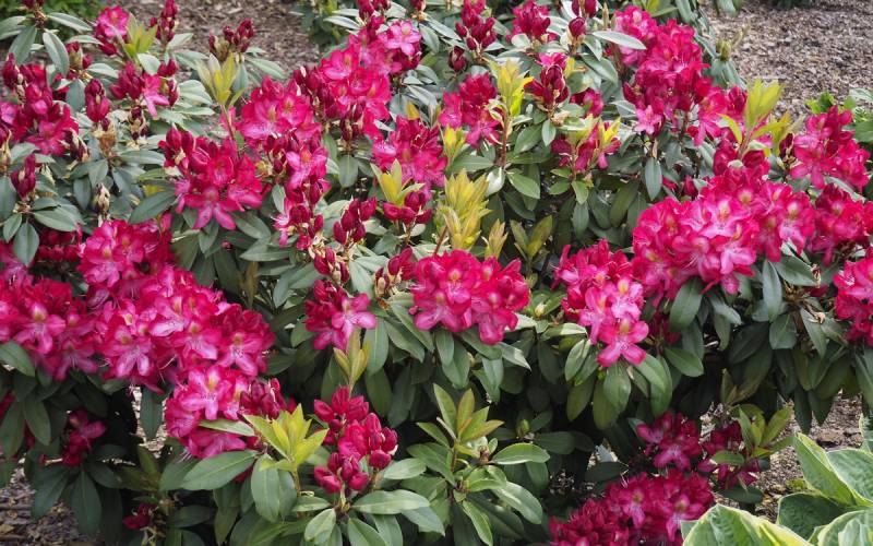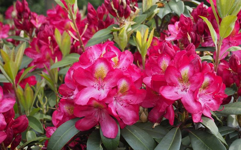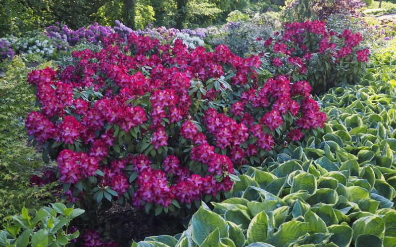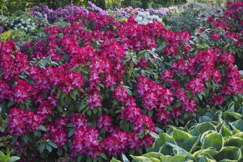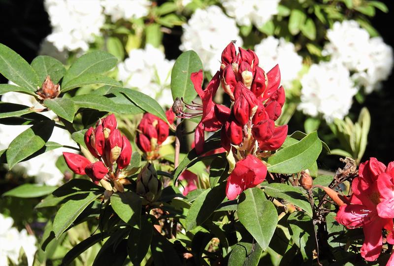 Rhododendron Junifeuer, jego ogniście czerwone kwiaty już z daleka rzucają się w oczy.