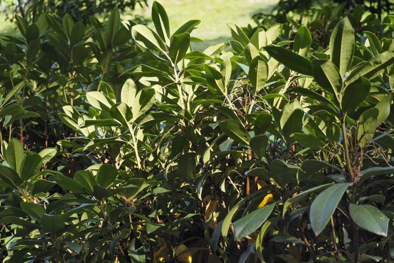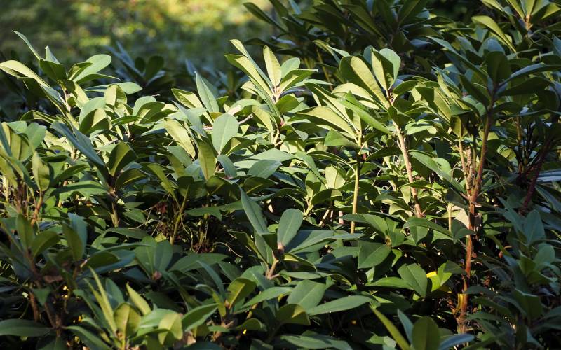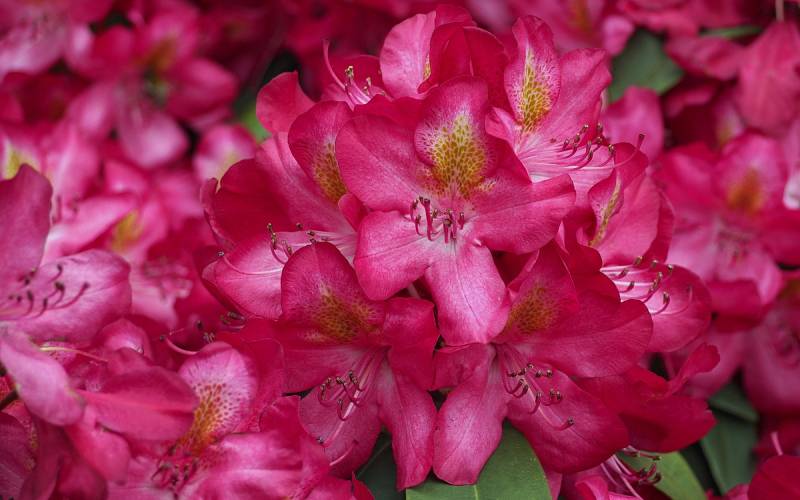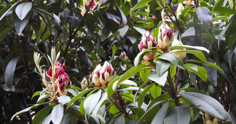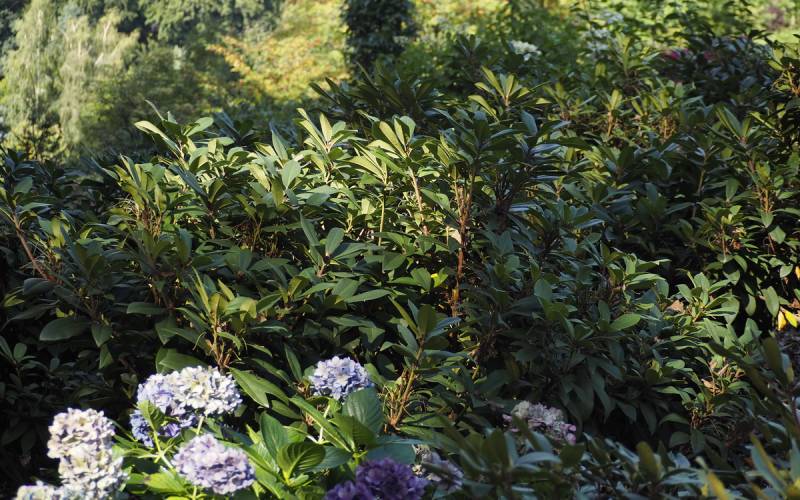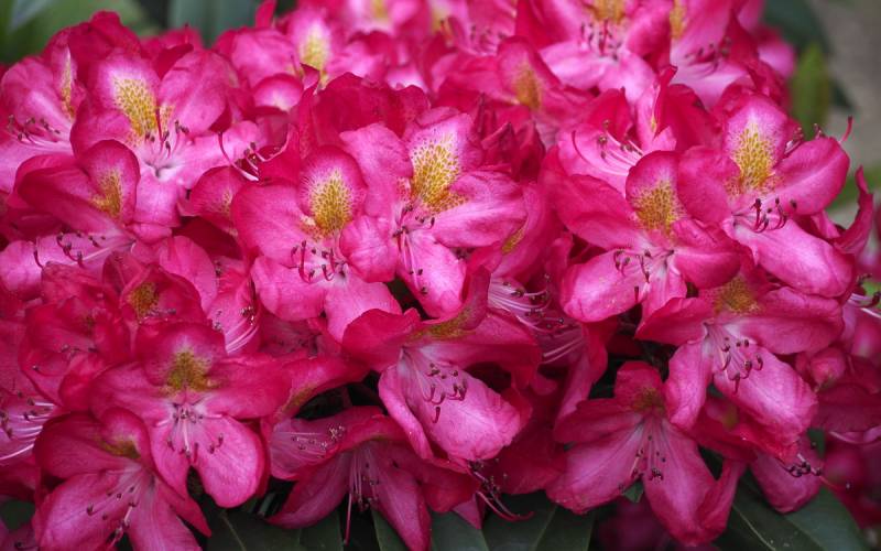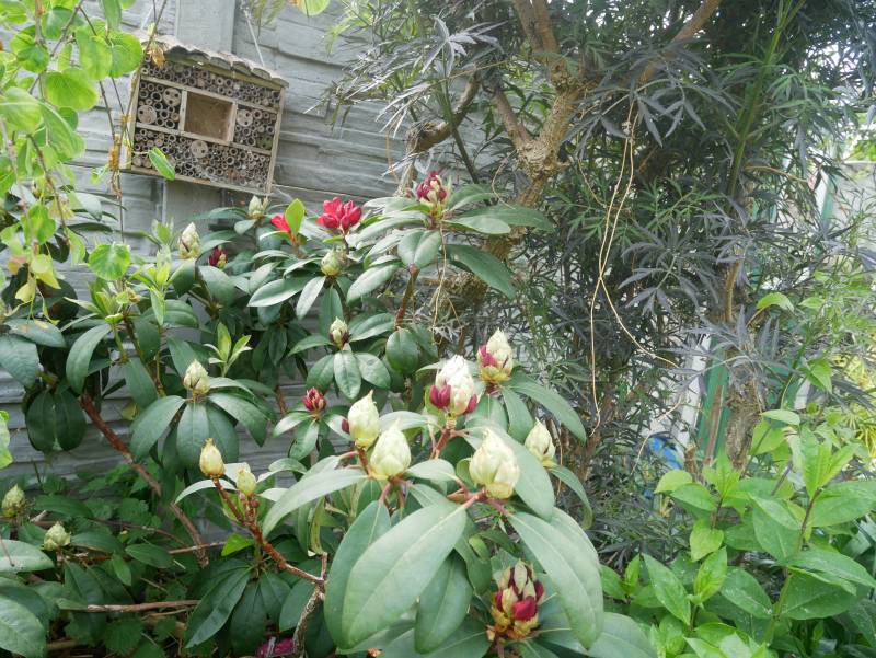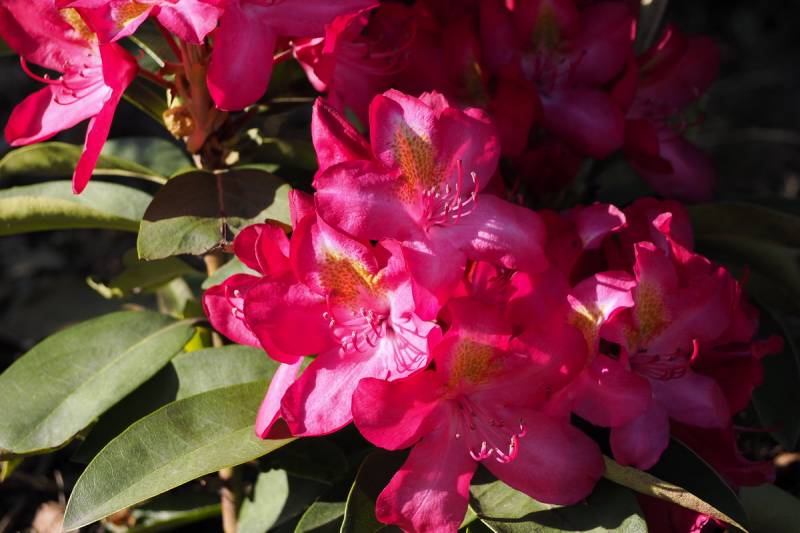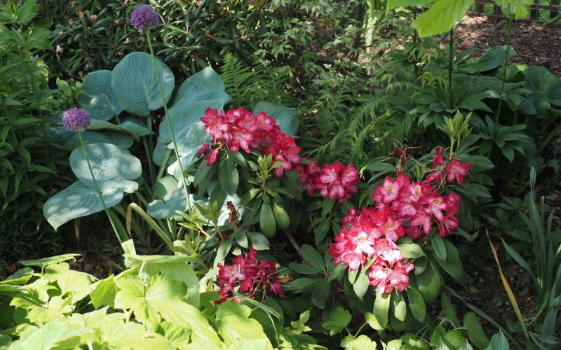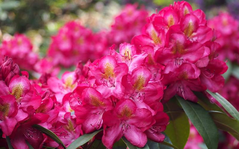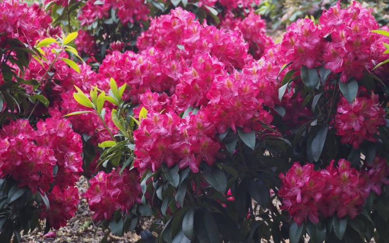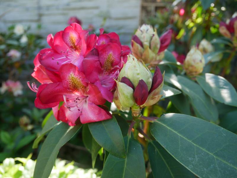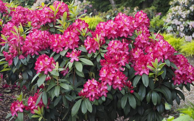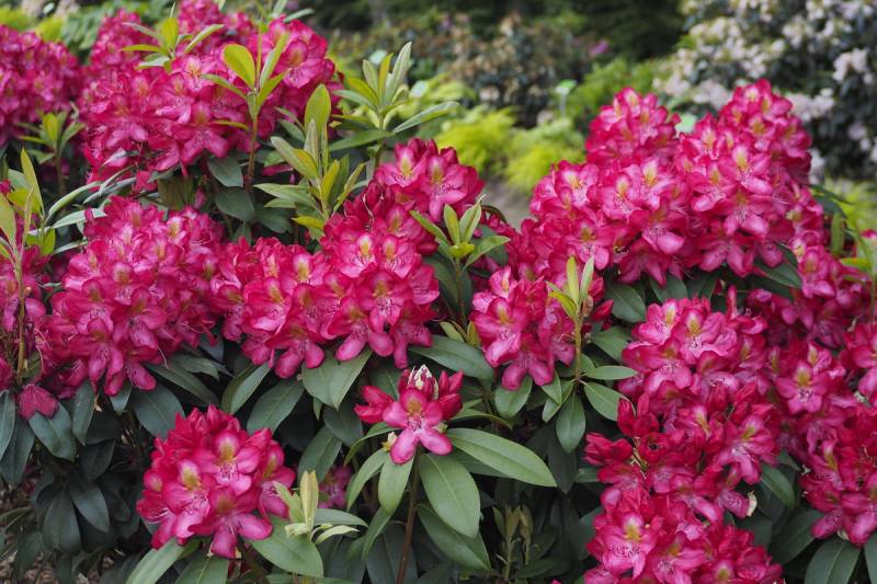 Rhododendron Junifeuer, jego ogniście czerwone kwiaty już z daleka rzucają się w oczy.
