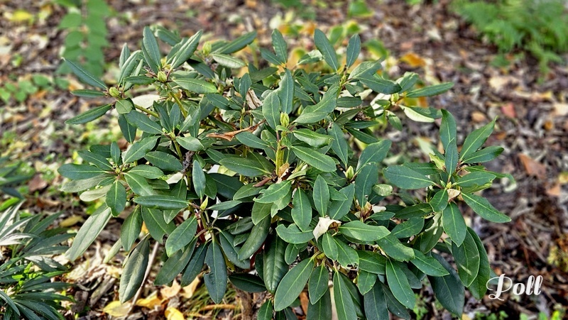 Liście: ciemnozielone, skórzaste, błyszczące z wierzchu, od spodu matowe i nieco jaśniejsze... wąsko eliptyczne... o długości do 11,5 cm przy szerokości do 4,5 cm